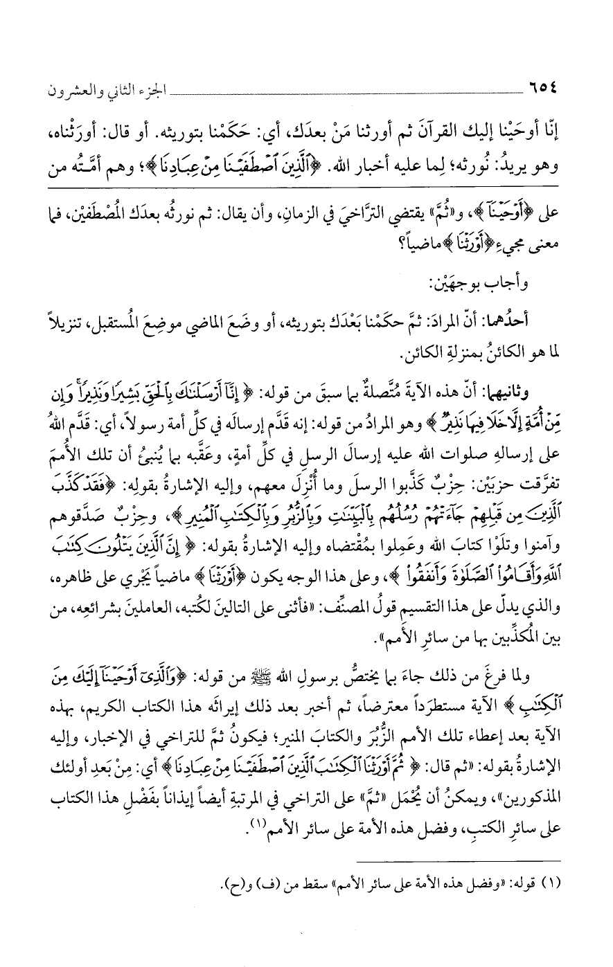 ولما فرغَ من ذلك جاءَ بما يختصُّ برسولِ الله صلى الله عليه وسلم من قوله: {وَالَّذِي أَوْحَيْنَا إِلَيْكَ مِنَ الْكِتَابِ} الآية مستطرَدًا معترضًا، ثم أخبر بعد ذلك إيراثَه هذا الكتاب الكريم، بهذه الآية بعد إعطاء تلك الأمم الزُّبُرَ والكتابَ المنير؛ فيكونُ ثمَّ للتراخي في الإخبار، وإليه الإشارةُ بقوله: ((ثم قال: {ثُمَّ أَوْرَثْنَا الْكِتَابَ الَّذِينَ اصْطَفَيْنَا مِنْ عِبَادِنَا} أي: مِنْ بَعدِ أولئك المذكورين))، ويمكنُ أن يُحْمَل ((ثمَّ)) على التراخي في المرتبةِ أيضًا إيذانًا بفَضْلِ هذا الكتاب على سائرِ الكتبِ، وفضل هذه الأمة على سائر الأمم.