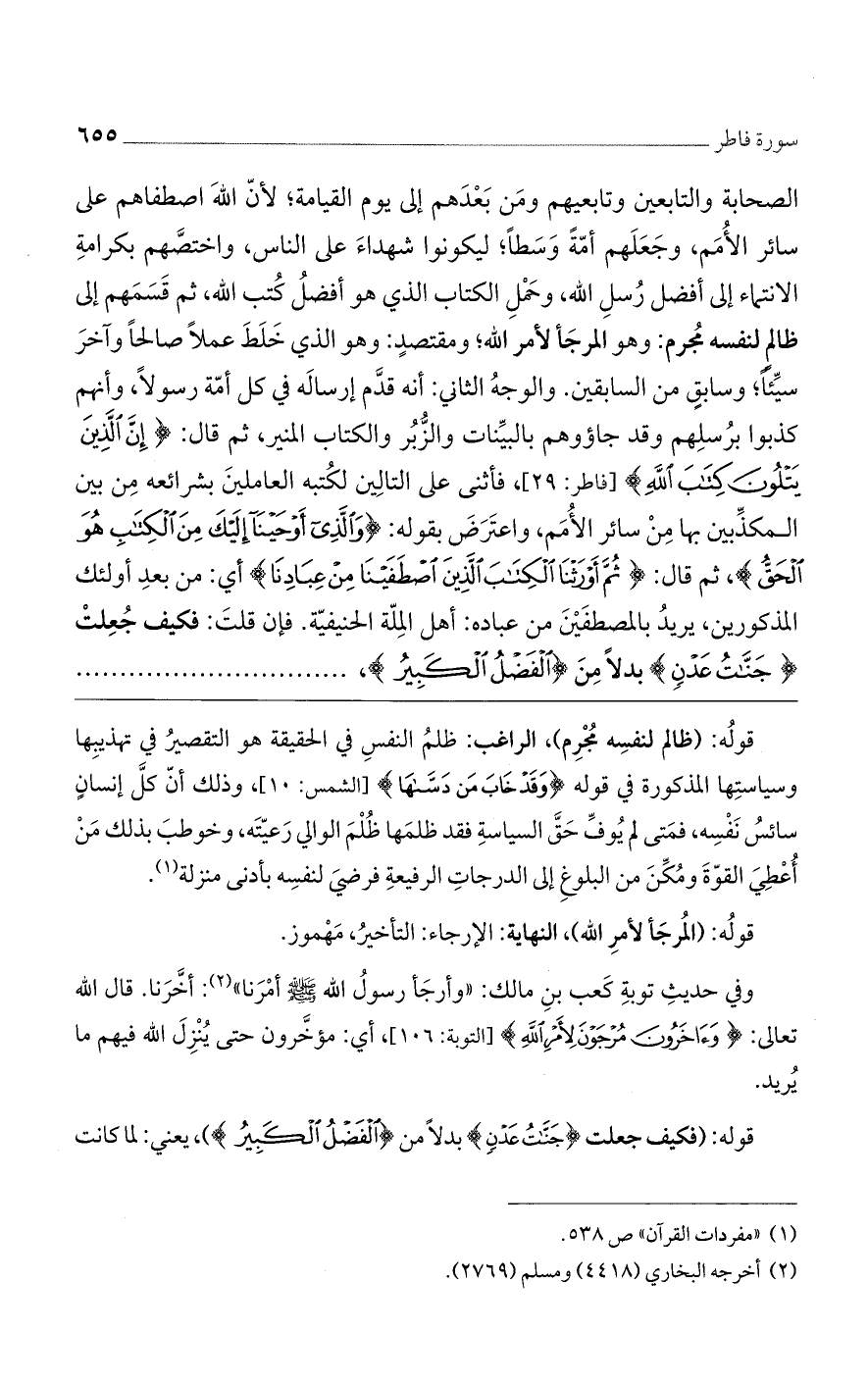 الصحابة والتابعين وتابعيهم ومن بعدهم إلى يوم القيامة؛ لأن الله اصطفاهم على سائر الأمم، وجعلهم أمة وسطًا؛ ليكونوا شهداء على الناس، واختصهم بكرامة الانتماء إلى أفضل رسل الله، وحمل الكتاب الذي هو أفضل كتب الله، ثم قسمهم إلى ظالم لنفسه مجرم: وهو المرجأ لأمر الله؛ ومقتصٍد: وهو الذي خلط عملًا صالحًا وآخر سيئًا؛ وسابق من السابقين. والوجه الثاني: أنه قدم إرساله في كل أمّة رسولًا، وأنهم كذبوا برسلهم وقد جاءوهم بالبينات والزبر والكتاب المنير، ثم قال: (إنّ الذين يتلون كتاب الله)] فاطر: 29 [، فأثنى على التالين لكتبه العاملين بشرائعه من بين المكذبين بها من سائر الأمم، واعترض بقوله: (وَالَّذِي أَوْحَيْنا إِلَيْكَ مِنَ الْكِتابِ هُوَ الْحَقُّ) ثم قال: (ثُمَّ أَوْرَثْنَا الْكِتابَ الَّذِينَ اصْطَفَيْنا مِنْ عِبادِنا) أى: من بعد أولئك المذكورين، يريد بالمصطفين من عباده: أهل الملة الحنيفية. فإن قلت: فكيف جعلت (جَنَّاتُ عَدْنٍ) بدلًا من (الفضل الكبير)،