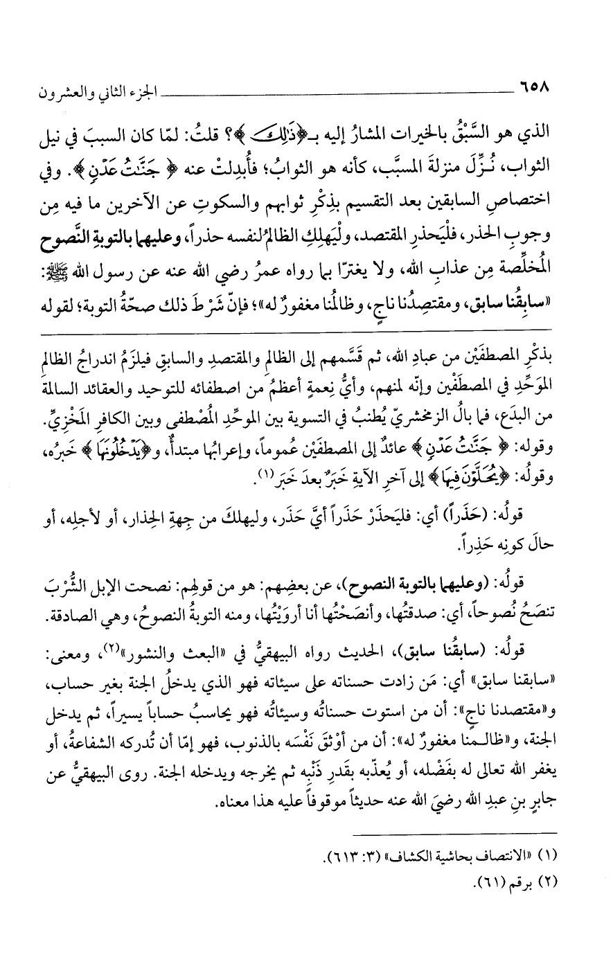 الذي هو السبق بالخيرات المشار إليه بـ (ذلك)؟ قلت: لما كان السبب في نيل الثواب، نزل منزلة المسبب، كأنه هو الثواب؛ فأبدلت عنه (جنات عدن). وفي اختصاص السابقين بعد التقسيم بذكر ثوابهم والسكوت عن الآخرين ما فيه من وجوب الحذر، فليحذر المقتصد، وليهلك الظالم لنفسه حذرًا، وعليهما بالتوبة النصوح المخلصة من عذاب الله، ولا يغترا بما رواه عمر رضى الله عنه عن رسول الله صلى الله عليه وسلم: «سابقنا سابق، ومقتصدنا ناج، وظالمنا مغفور له»؛ فإنّ شرط ذلك صحة التوبة؛ لقوله