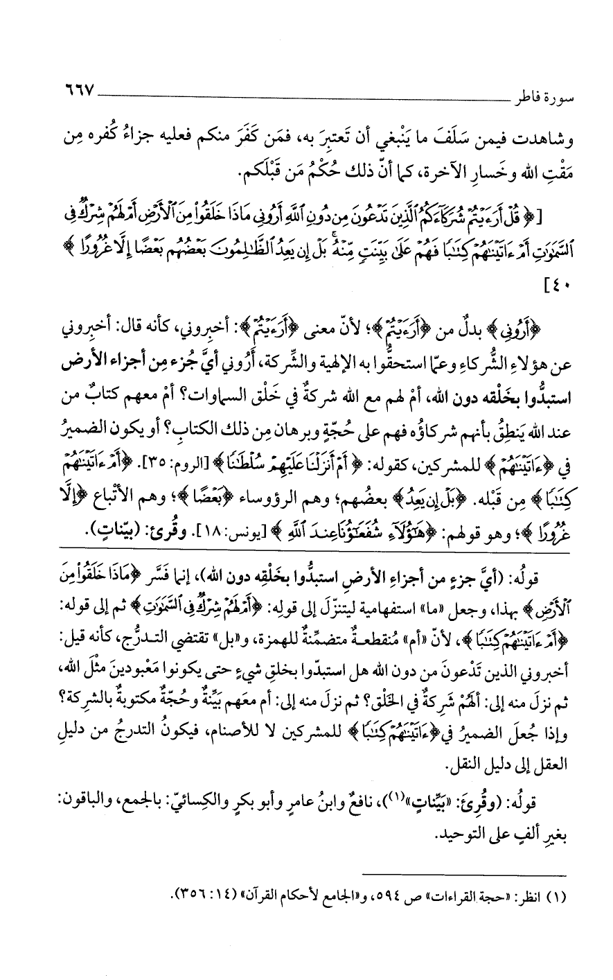 (أَرُونِي) بدل من (أرأيتم)؛ لأنّ معنى (أرأيتم): أخبرونى، كأنه قال: أخبرونى عن هؤلاء الشركاء وعما استحقوا به الإلهية والشركة، أرونى أى جزء من أجزاء الأرض استبدوا بخلقه دون الله، أم لهم مع الله شركة في خلق السماوات؟ أم معهم كتاب من عند الله ينطق بأنهم شركاؤه فهم على حجة وبرهان من ذلك الكتاب؟ أو يكون الضمير في (آتَيْناهُمْ) للمشركين، كقوله: (أَمْ أَنْزَلْنا عَلَيْهِمْ سُلْطاناً)] الروم: 35 [. (أم آتيناهم كتابا) من قبله. (بل إن يعد) بعضهم؛ وهم الرؤساء (بَعْضاً)؛ وهم الأتباع (إِلَّا غُرُوراً)؛ وهو قولهم: (هؤُلاءِ شُفَعاؤُنا عِنْدَ الله)] يونس: 18 [. وقرئ: (بينات).