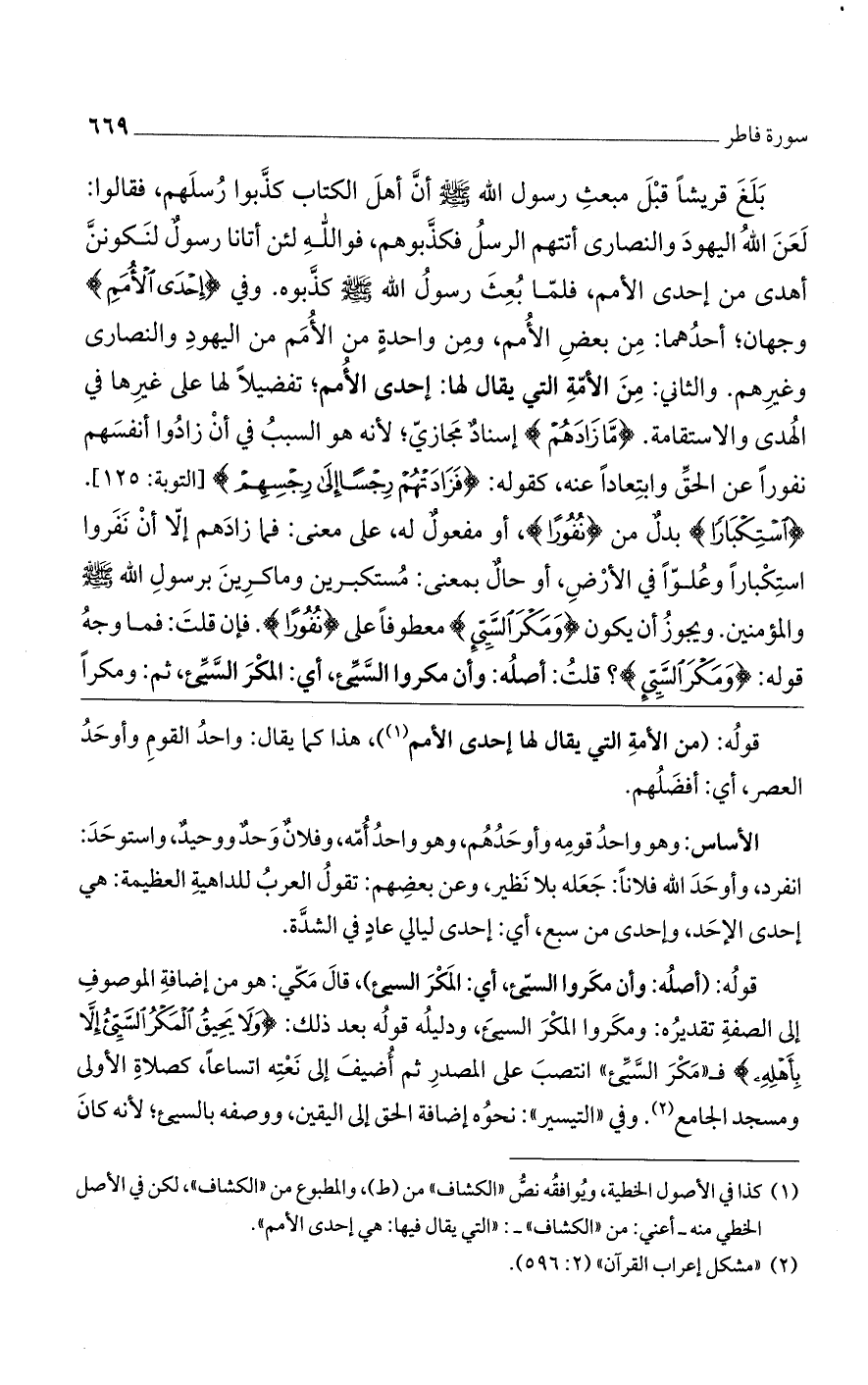 بلغ قريشًا قبل مبعث رسول الله صلى الله عليه وسلم أنّ أهل الكتاب كذبوا رسلهم، فقالوا: لعن الله اليهود والنصارى أتتهم الرسل فكذبوهم، فو الله لئن أتانا رسوٌل لنكونن أهدى من إحدى الأمم، فلما بعث رسول الله صلى الله عليه وسلم كذبوه. وفي (إِحْدَى الْأُمَمِ) وجهان؛ أحدهما: من بعض الأمم، ومن واحدةٍ من الأمم من اليهود والنصارى وغيرهم. والثاني: من الأمّة التي يقال لها إحدى الأمم؛ تفضيلًا لها على غيرها في الهدى والاستقامة. (ما زادَهُمْ) إسناد مجازى؛ لأنه هو السبب في أن زادوا أنفسهم نفورًا عن الحق وابتعادًا عنه، كقوله: (فَزادَتْهُمْ رِجْساً إِلَى رِجْسِهِمْ)] التوبة: 125 [. (اسْتِكْباراً) بدل من (نفورا)، أو مفعول له، على معنى: فما زادهم إلا أن نفروا استكبارًا وعلوًّا فِي الْأَرْضِ، أو حال بمعنى: مستكبرين وماكرين برسول الله صلى الله عليه وسلم والمؤمنين. ويجوز أن يكون (وَمَكْرَ السَّيِّئِ) معطوفًا على نفورًا فإن قلت: فما وجه قوله: (وَمَكْرَ السَّيِّئِ)؟ قلت: أصله: وأن مكروا السيئ، أى المكر السيئ، ثم ومكرا