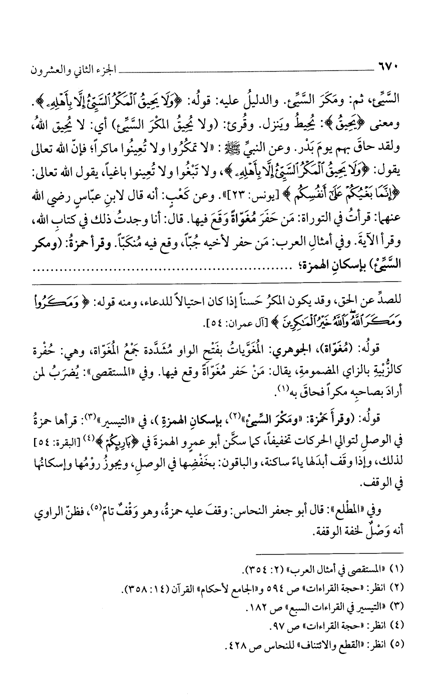 قولُه: (وقرأَ حَمْزة: ((ومَكْرَ السِّيْئ))، بإسكانِ الهمزةِ)، في ((التيسير)): قرأها حمزةُ في الوصلِ لتوالي الحركات تخفيفًا، كما سكَّن أبو عمروٍ والهمزةَ في {بَارِئِكُمْ} [البقرة: 54] لذلك، وإذا وقَف أبدَلها ياءً ساكنة، والباقون: بخَفْضِها في الوصلِ، ويجوزُ روْمُها وإسكانُها في الوقف.