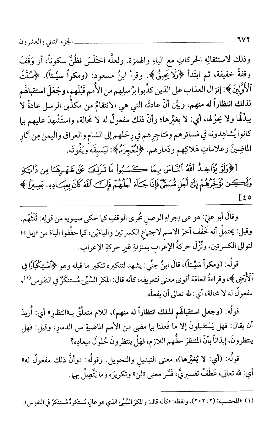 وذلك لاستثقاله الحركات مع الياء والهمزة، ولعله اختلس فظنّ سكونًا، أو وقف وقفةً خفيفة، ثم ابتدأ (وَلا يَحِيقُ). وقرأ ابن مسعود: (ومكرا سيئا). (سُنَّتَ الْأَوَّلِينَ): إنزال العذاب على الذين كذبوا برسلهم من الأمم قبلهم، وجعل استقبالهم لذلك انتظارًا له منهم، وبين أنّ عادته التي هي الانتقام من مكذبي الرسل عادة لا يبدلها ولا يحولها، أى: لا يغيرها؛ وأنّ ذلك مفعول له لا محالة، واستشهد عليهم بما كانوا يشاهدونه في مسائرهم ومتاجرهم في رحلهم إلى الشام والعراق واليمن من آثار الماضين وعلامات هلاكهم ودمارهم. (لِيُعْجِزَهُ): ليسبقه ويفوته.