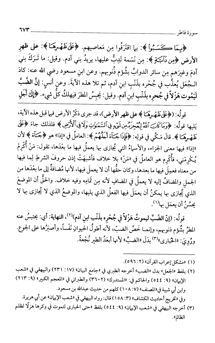 قولُه: (إنّ الضّبَّ ليموتُ هَزْلاً في جُحْرِه بذَنْب ابنِ آدم)، النهاية: أي: يحتبسُ عنه المطرُ بشُؤم ذنوبهم، وإنما خَصَّ الضبّ، لأنه أطولُ الحيوانِ نَفْسًا، وأصبَرُها على الجوع.