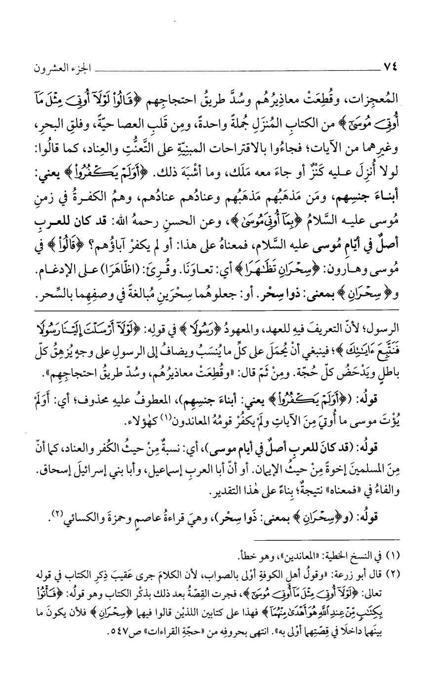 قولُه: (و {سِحْرَانِ} بمعنى: ذَوا سِحْر)، وهيَ قراءةُ عاصمٍ وحمزةَ والكسائي.