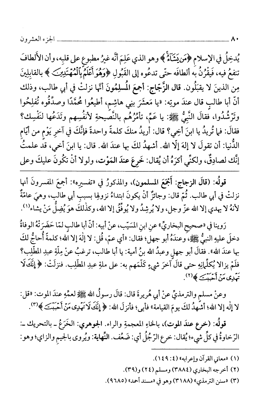 قولُه: (قالَ الزجاج: أَجْمَعَ المسلمون)، والمذكورُ في ((تفسيرِه)): أجمعَ المفسرونَ أنها نزلتْ في أبي طالب. ثُمّ قال: وجائزٌ أنْ يكونَ ابتداءُ نزولِها بسببِ أبي طالب، وهيَ عامّةٌ لأنهُ لا يهدي إلا الله عزّ وجل، ولا يُرشِدُ ولا يُوفِّقُ إلا الله، وكذلكَ هوَ يُضِلُّ مَنْ يشاء.
