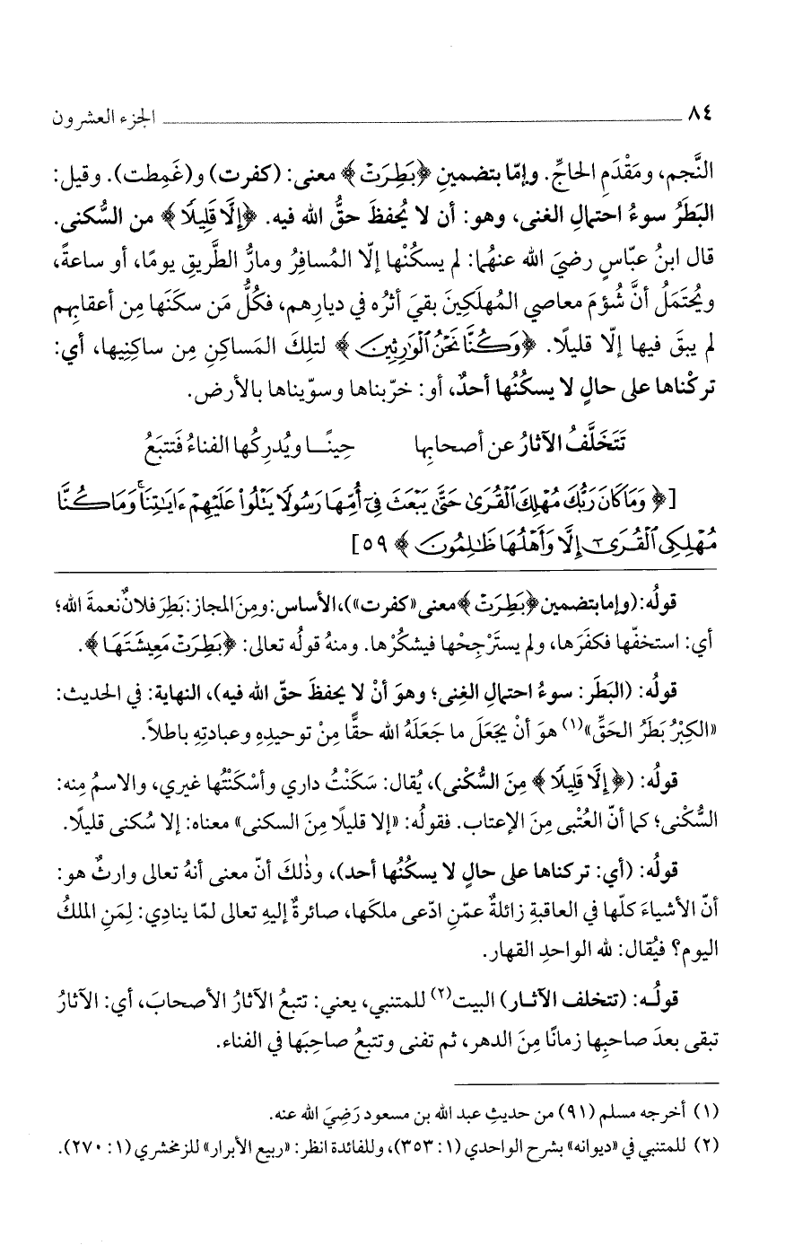 النجم، ومقدم الحاج. وإمّا بتضمين (بَطِرَتْ) معنى: (كفرت) و (غمطت). وقيل: البطر سوء احتمال الغنى, وهو: أن لا يحفظ حق الله فيه. (إِلَّا قَلِيلًا) من السكنى. قال ابن عباس رضى الله عنهما: لم يسكنها إلا المسافر ومارّ الطريق يوماً, أو ساعةًً, ويحتمل أنّ شؤم معاصى المهلكين بقي أثره في ديارهم، فكل من سكنها من أعقابهم لم يبق فيها إلا قليلاً. (وَكُنَّا نَحْنُ الْوارِثِينَ) لتلك المساكن من ساكنيها، أى: تركناها على حالٍ لا يكنها أحدٌ، أو: خرّبناها وسوّيناها بالأرض.