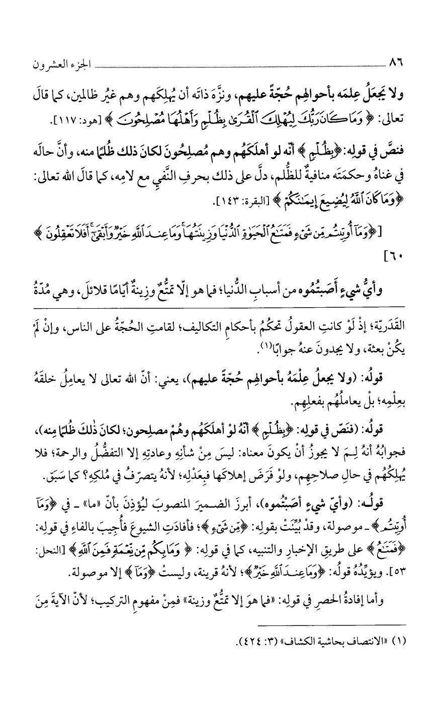 قولُه: (فنَصّ في قولِه: {بِظُلْمٍ} أنّهُ لوْ لأهلَكَهُم وهُمْ مصلِحون؛ لكانَ ذلكَ ظُلمًا مِنه)، فجوابُهُ أنهُ لِمَ لا يجوزُ أنْ يكونَ معناه: ليسَ مِنْ شأنِهِ وعادتِهِ إلا التفضُّلُ والرحمة؛ فلا يُهلِكُهُم في حالِ صلاحِهِم، ولوْ فَرَضَ إهلاكَها فبِعَدِلِه؛ لأنهُ يتصرّفُ في مُلكِهِ؟ كما سَبَق.