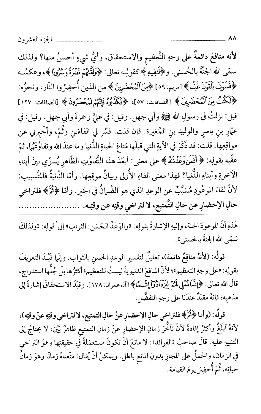 قولُه: (وأما {ثُمَّ} فلتراخي حالِ الإحضارِ عنْ حالِ التمتيع، لا لتراخي وقتِهِ عنْ وقتِه)، لأنهُ أبلَغُ وأكثرُ إفادةً لأنّ تأخُّرَ زمانِ الإحضارِ عنْ زمانِ التمتيعِ ظاهرٌ بَيِّن، لا يحتاجُ إلى التنبيهِ عليه. قالَ صاحبُ ((الفرائد)): لا مانعَ أنْ تكونَ مستعمَلةً في حقيقتِها وهوَ التراخي في الزمان، والحملُ على المجازِ بدونِ المانعِ باطل. ويمكنُ أنْ يُقال: متّعناهُ زمانًا وهوَ زمانُ حياتِه، ثُمّ أُحضِرَ يومَ القيامة.
