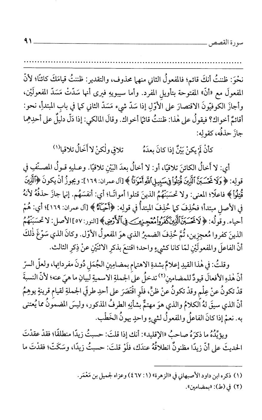 أي: لا أَخالُ الكائنَ تلاقيًا، أو: لا أخالُ بعدَ البَيْنِ تلاقيًا. وعليهِ قولُ المصنّفِ في قولِهِ: {وَلاَ تَحْسَبَنَّ الَّذِينَ قُتِلُوا فِي سَبِيلِ اللهِ أَمْوَاتَا} [آل عمران: 169]: ويجوزُ أنْ يكونَ {الَّذِينَ قُتِلُوا} فاعلاً؛ المعنى: ولا تحسَبَنّهُمُ الذينَ قتلوا أمواتًا؛ أي: أنفسَهُم. إنما جازَ حذفُهُ لأنهُ في الأصلِ مبتدأ؛ فحُذِفَ كما حُذِفَ المبتدأُ في قولِهِ: {أَحْيَاءُ} [آل عمران: 169]؛ أي: هُمْ أحياء. وقولُه: {لاَ تَحْسَبَنَّ الَّذِينَ كَفَرُوا مُعْجِزِينَ فِي الأَرْضِ} [النور: 57] الأصل: لا تحسَبَنّهُمُ الذينَ كفروا مُعجِزِين، ثُمَّ حُذِفَ الضميرُ الذي هوَ المفعولُ الأوّل. وكانَ الذي سَوّغَ ذلكَ أنّ الفاعلَ والمفعولَيْنِ لمّا كانا كشيءٍ واحد؛ اقتنعَ بذكرِ الاثنَيْنِ عنْ ذِكرِ الثالث.