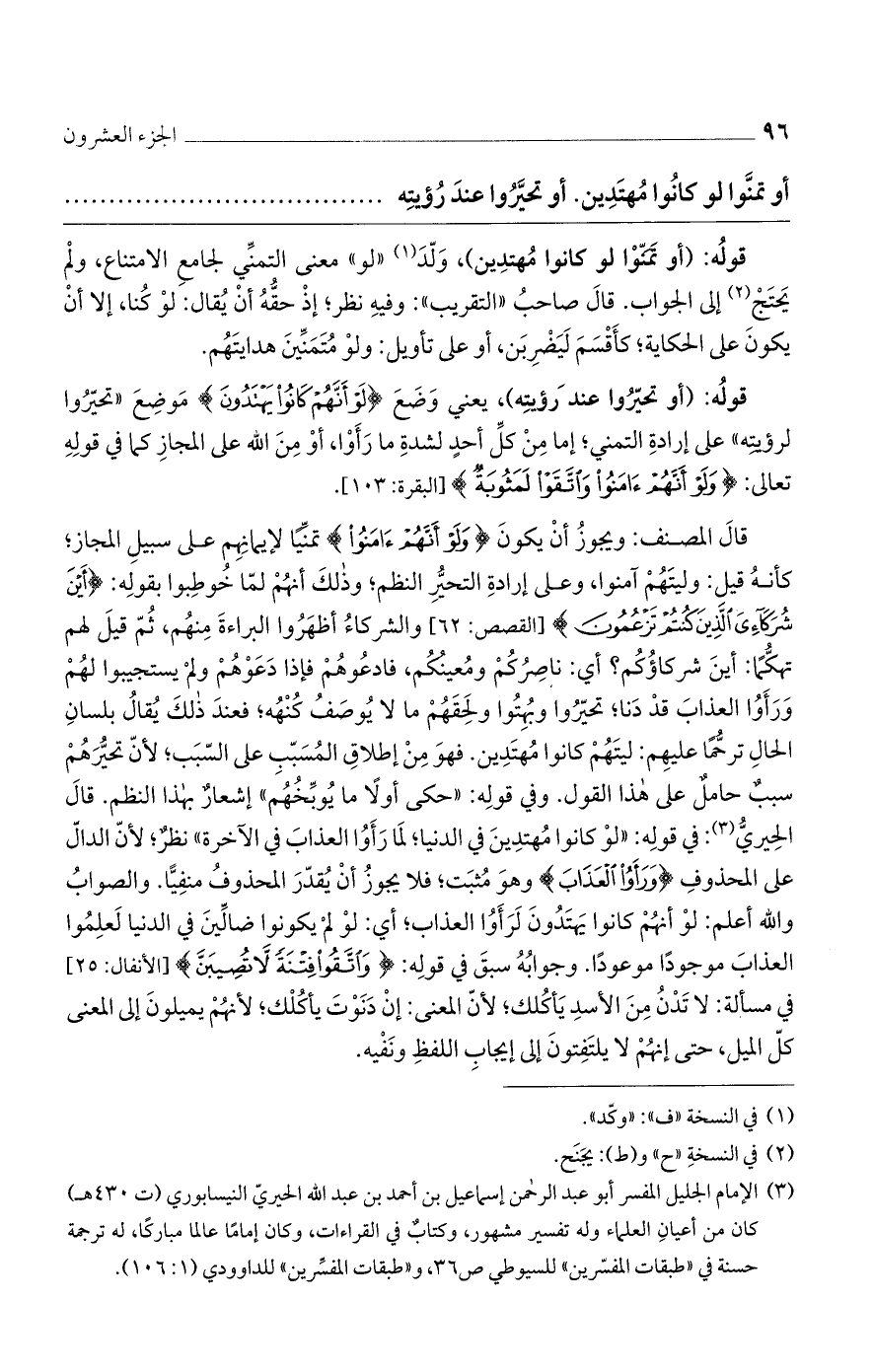 قولُه: (أو تحيّرُوا عند رؤيتِه)، يعني وَضَعَ {لَوْ أَنَّهُمْ كَانُوا يَهْتَدُونَ} مَوضِعَ ((تحيّرُوا لرؤيتِه)) على إرادةِ التمني؛ إما مِنْ كلِّ أحدٍ لشدةِ ما رَأَوْا، أوْ مِنَ الله على المجازِ كما في قولِهِ تعالى: {وَلَوْ أَنَّهُمْ آمَنُوا وَاتَّقَوْا لَمَثُوبَةٌ} [البقرة: 103].