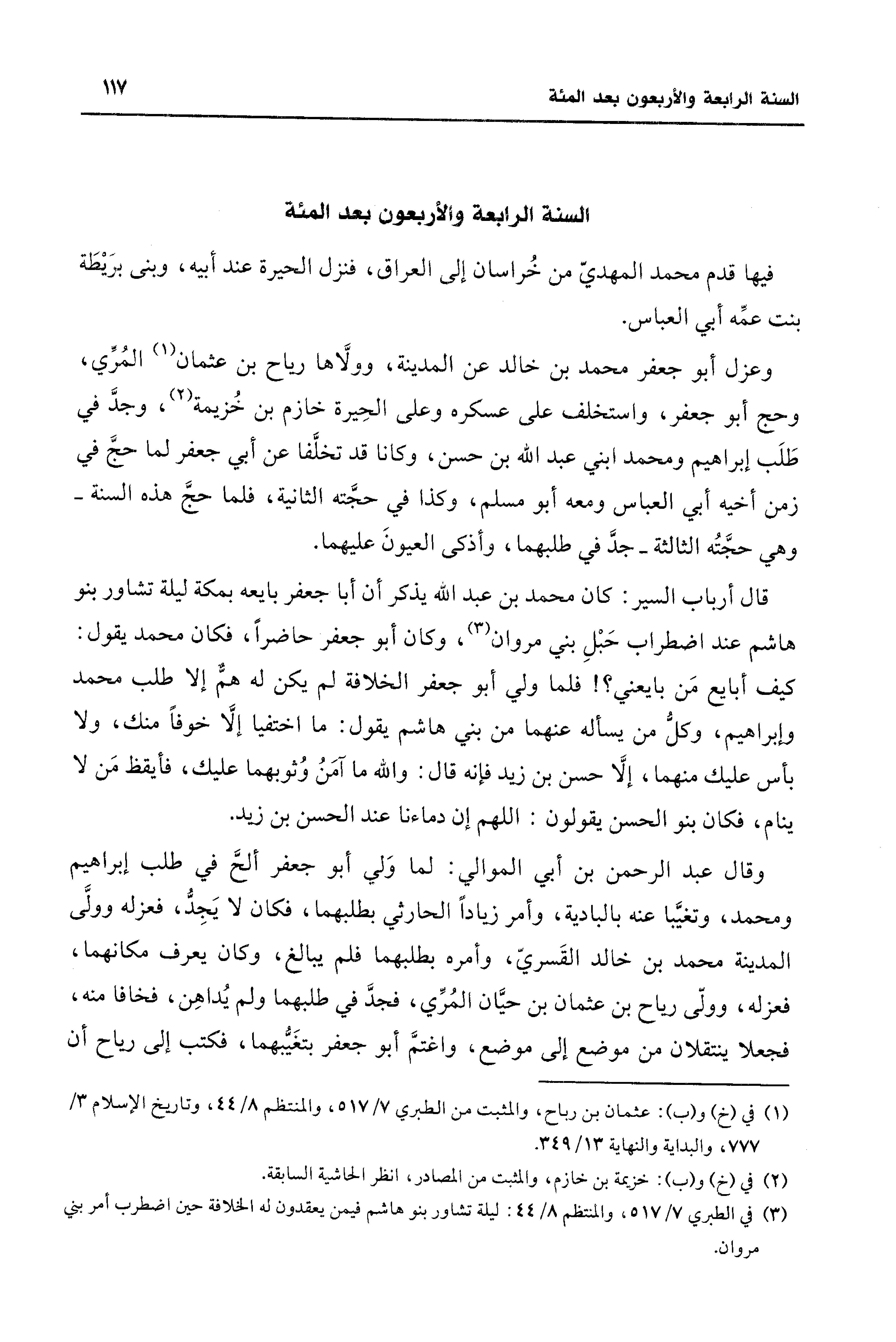 وعزل أبو جعفر محمَّد بن خالد عن المدينة، وولَّاها رياح بن عثمان (¬1) المُرِّي، وحج أبو جعفر، واستخلف على عسكره وعلى الحِيرة خازم بن خُزيمة (¬2)، وجدِّ في طَلَب إبراهيم ومحمَّد ابني عبد الله بن حسن، وكانا قد تخلَّفا عن أبي جعفر لما حجَّ في زمن أخيه أبي العباس وععه أبو مسلم، وكذا في حجَّته الثَّانية، فلما حجَّ هذه السنة -وهي حجَّتُه الثالثة- جدَّ في طلبهما، وأذكى العيونَ عليهما.