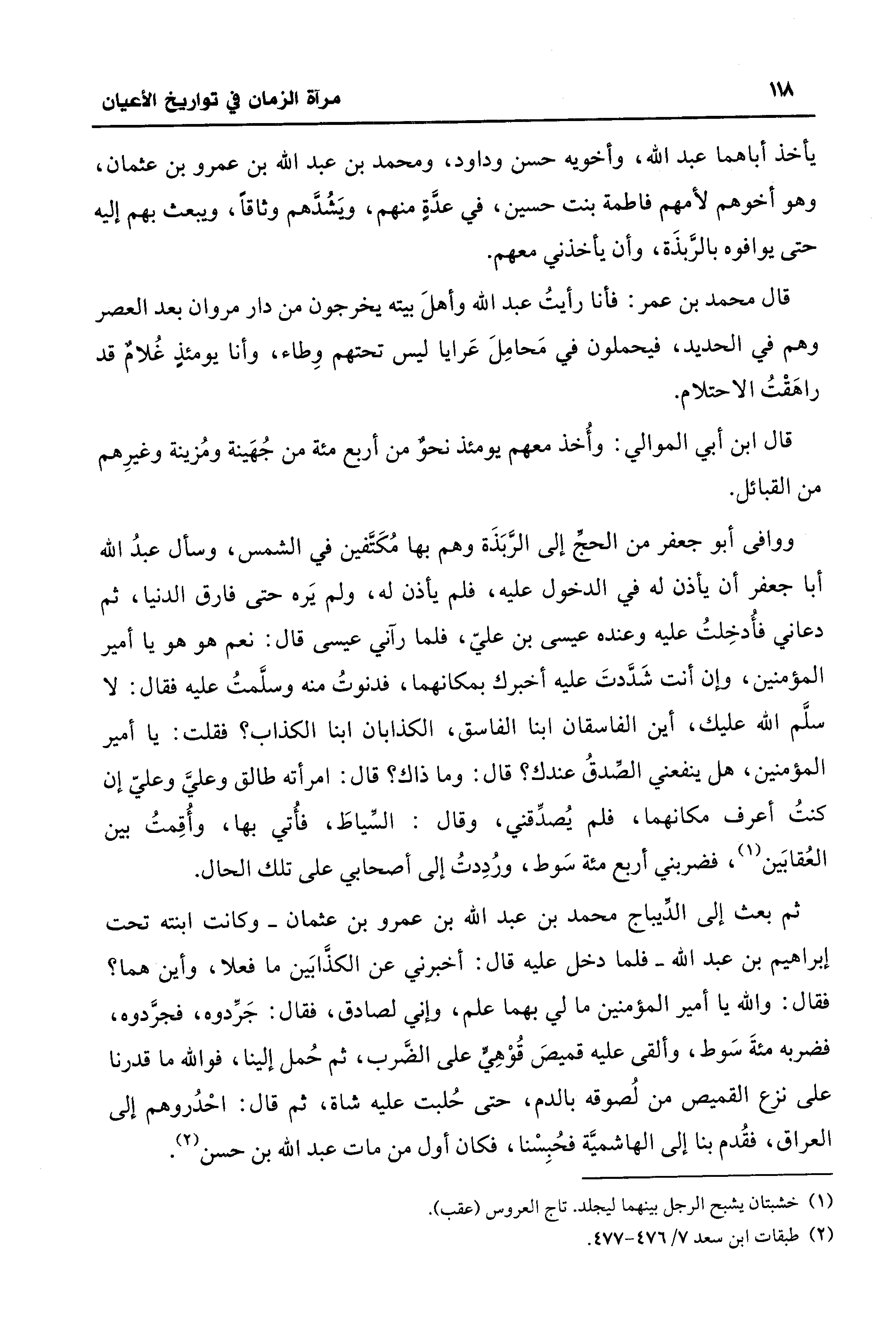 ووافى أبو جعفر من الحج إلى الرَّبَذَة وهم بها مُكَتَّفين في الشَّمس، وسأل عبد الله أَبا جعفر أن يأذن له في الدخول عليه، فلم يأذن له، ولم يَره حتَّى فارق الدنيا، ثم دعاني فأُدخِلتُ عليه وعنده عيسى بن عليّ، فلما رآني عيسى قال: نعم هو هو يَا أمير المُؤْمنين، وإن أَنْتَ شَدَّدتَ عليه أخبرك بمكانهما، فدنوتُ منه وسلَّمتُ عليه فقال: لا سلَّم الله عليك، أين الفاسقان ابنا الفاسق، الكذابان ابنا الكذاب؟ فقلت: يَا أمير المُؤْمنين، هل ينفعني الضدقُ عندك؟ قال: وما ذاك؟ قال: امرأته طالق وعليَّ وعليّ إن كنتُ أعرف مكانهما، فلم يُصدِّقني، وقال: السِّياطَ، فأُتي بها، وأُقِمتُ بين العُقابَين (¬1)، فضربني أربع مئة سَوط، ورُدِدتُ إلى أصحابي على تلك الحال.