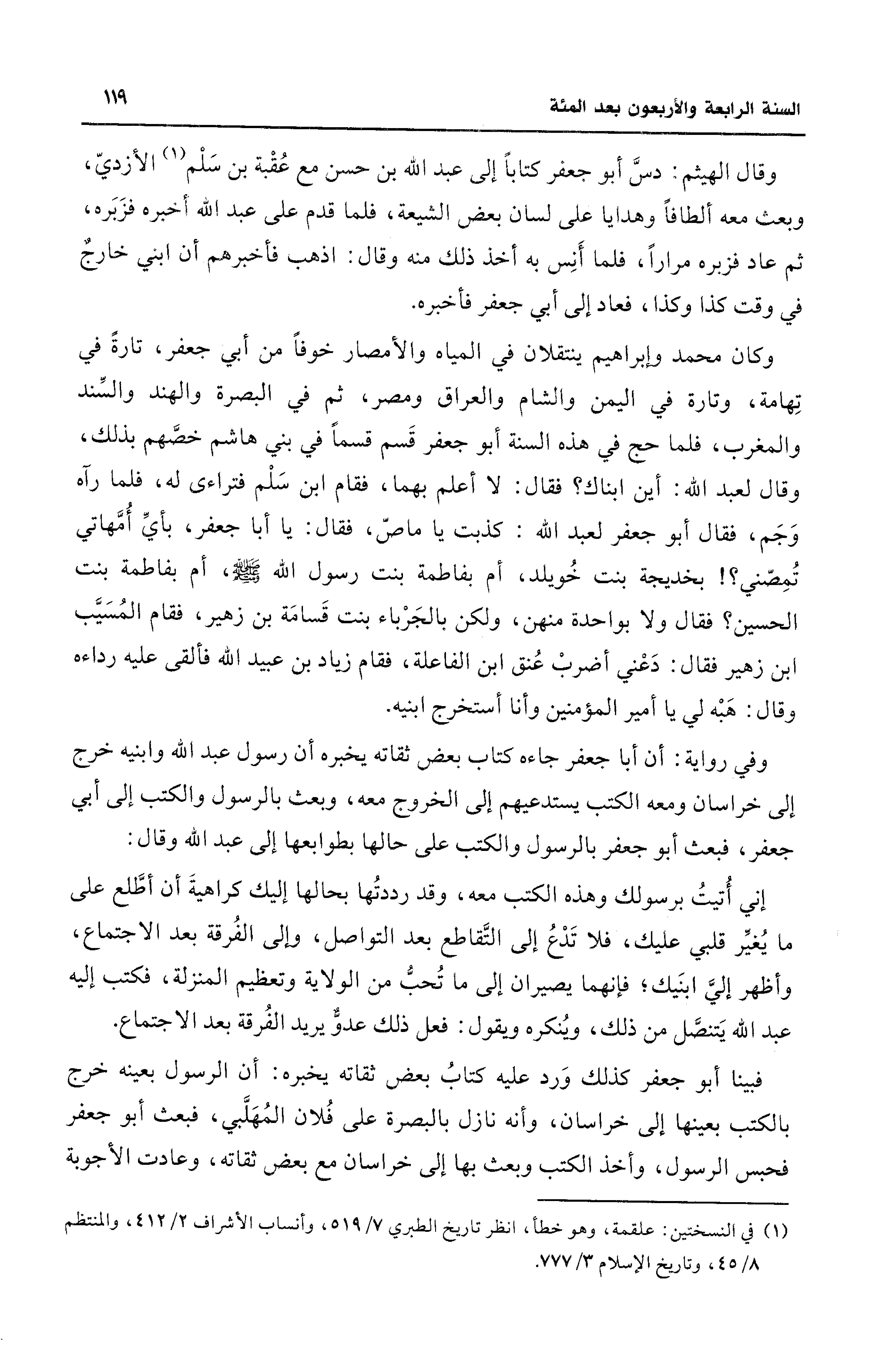 وقال الهيثم: دسَّ أبو جعفر كتابًا إلى عبد الله بن حسن مع عُقْبة بن سَلْم (¬1) الأَزدِيّ، وبعث معه ألطافًا وهدايا على لسان بعض الشيعة، فلما قدم على عبد الله أخبره فزَبَره، ثم عاد فزبره مرارًا، فلما أَنِس به أخذ ذلك منه وقال: اذهب فأخبرهم أن ابني خارجٌ في وقت كذا وكذا، فعاد إلى أبي جعفر فأخبره.