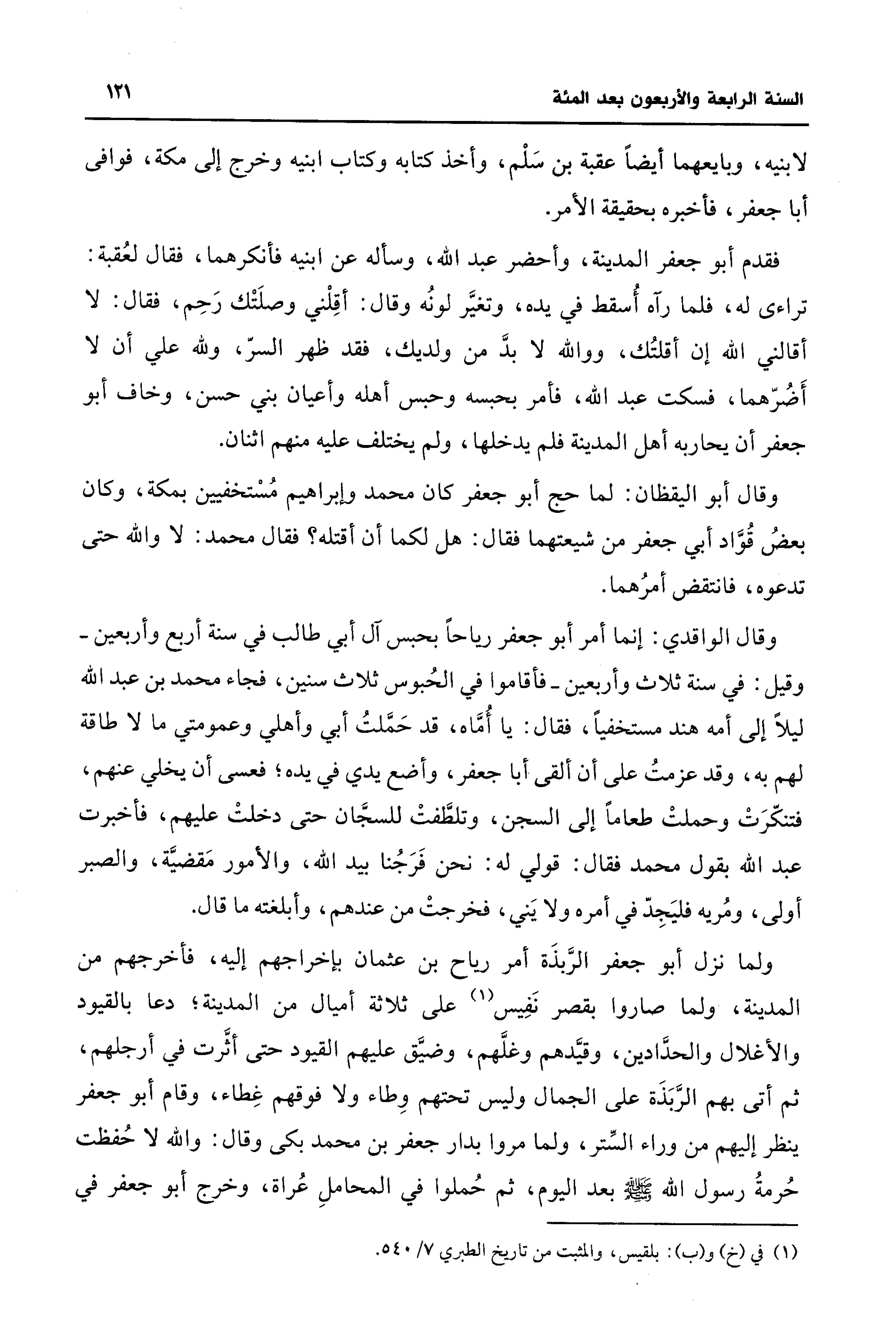 ولما نزل أبو جعفر الرَّبذَة أمر رياح بن عثمان بإخراجهم إليه، فأخرجهم من المدينة، ولما صاروا بقصر نَفِيس (¬1) على ثلاثة أميال من المدينة؛ دعا بالقيود والأغلال والحدَّادين، وقيَّدهم وغلَّهم، وضيَّق عليهم القيود حتَّى أثَّرت في أرجلهم، ثم أتى بهم الرَّبَذَة على الجمال وليس تحتهم وطاء ولا فوقهم غِطاء، وقام أبو جعفر ينظر إليهم من وراء السِّتر، ولما مووا بدار جعفر بن محمَّد بكى وقال: والله لا حُفظت حُرمةُ رسول الله - صلى الله عليه وسلم - بعد اليوم، ثم حُملوا في المحاملِ عُراة، وخرج أبو جعفر في
