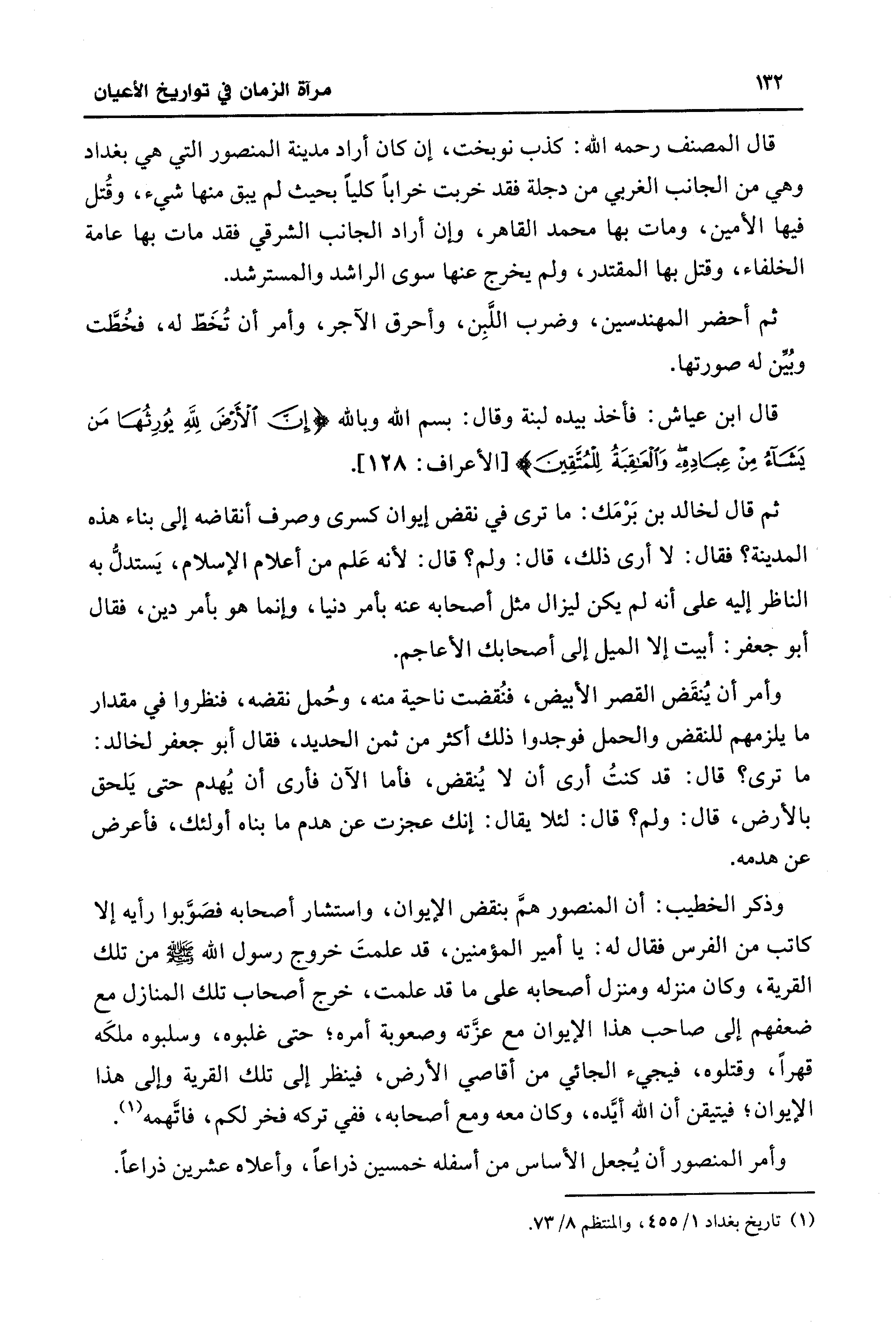 ثم قال لخالد بن بَرْمَك: ما ترى في نقض إيوان كسرى وصرف أنقاضه إلى بناء هذه المدينة؟ فقال: لا أرى ذلك، قال: ولم؟ قال: لأنه عَلم من أعلام الإِسلام، يَستدلُّ به الناظر إليه على أنَّه لم يكن ليزال مثل أصحابه عنه بأمر دنيا، وإنما هو بأمر دين، فقال أبو جعفر: أبيت إلَّا الميل إلى أصحابك الأعاجم.