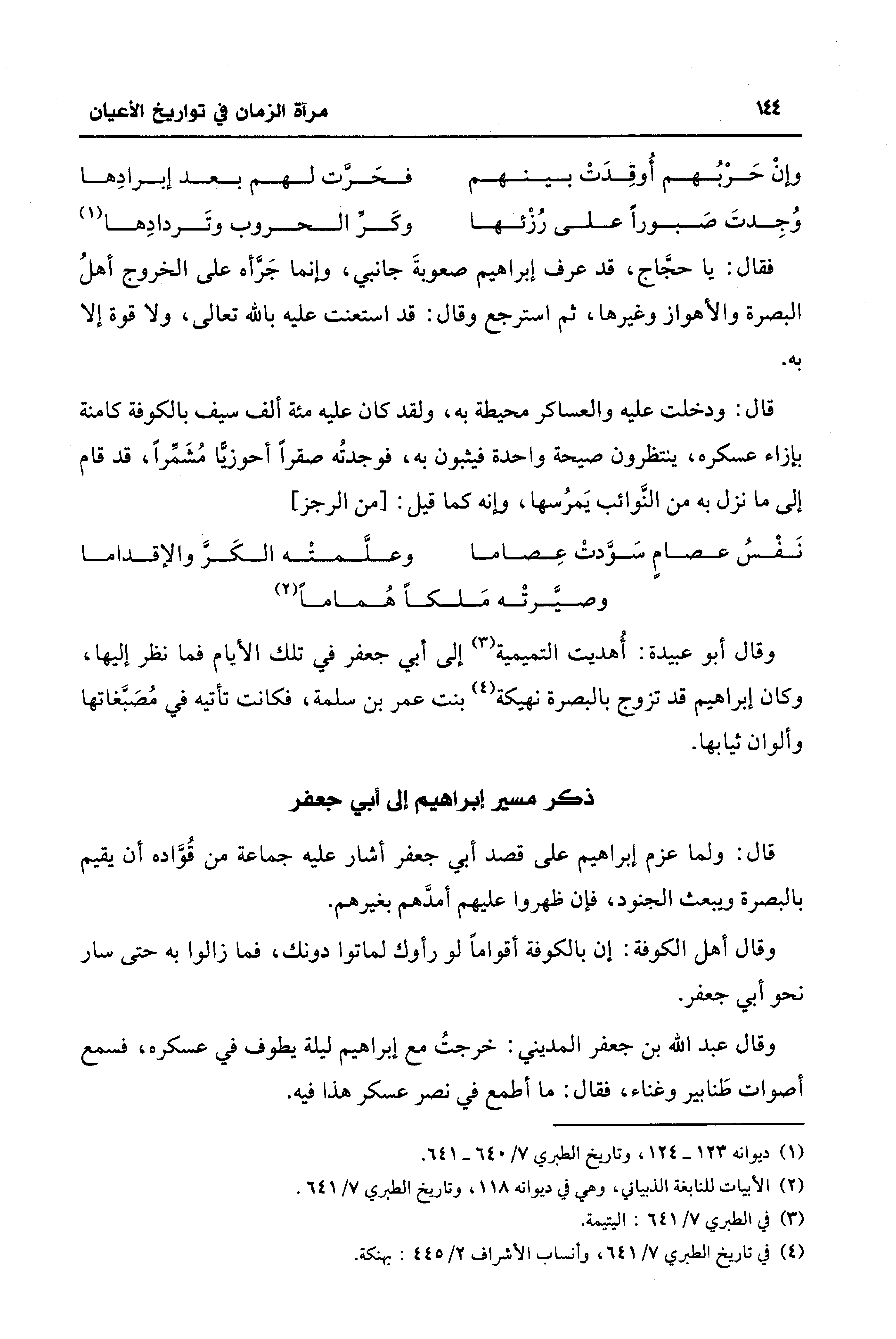 وقال أبو عبيدة: أُهديت التميمية (¬3) إلى أبي جعفر في تلك الأيام فما نظر إليها، وكان إبراهيم قد تزوج بالبصرة نهيكة (¬4) بنت عمر بن سلمة، فكانت تأتيه في مُصَبَّغاتها وألوان ثيابها.