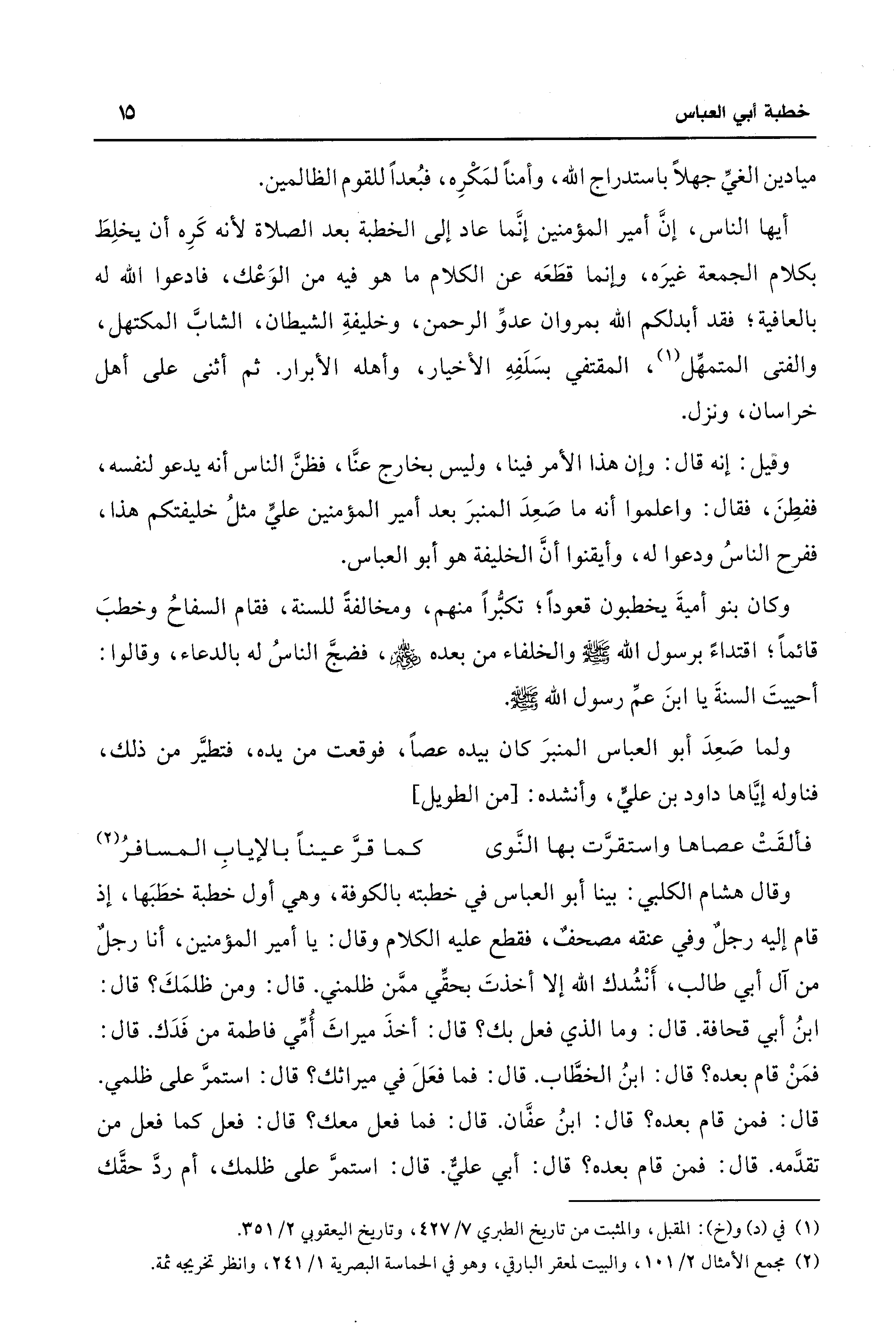 وقيل: إنه قال: وإن هذا الأمر فينا، وليس بخارج عنَّا، فظنَّ الناس أنه يدعو لنفسه، ففطِنَ، فقال: واعلموا أنه ما صَعِدَ المنبرَ بعد أمير المؤمنين عليٍّ مثلُ خليفتكم هذا، ففرح الناسُ ودعوا له، وأيقنوا أنَّ الخليفة هو أبو العباس.
