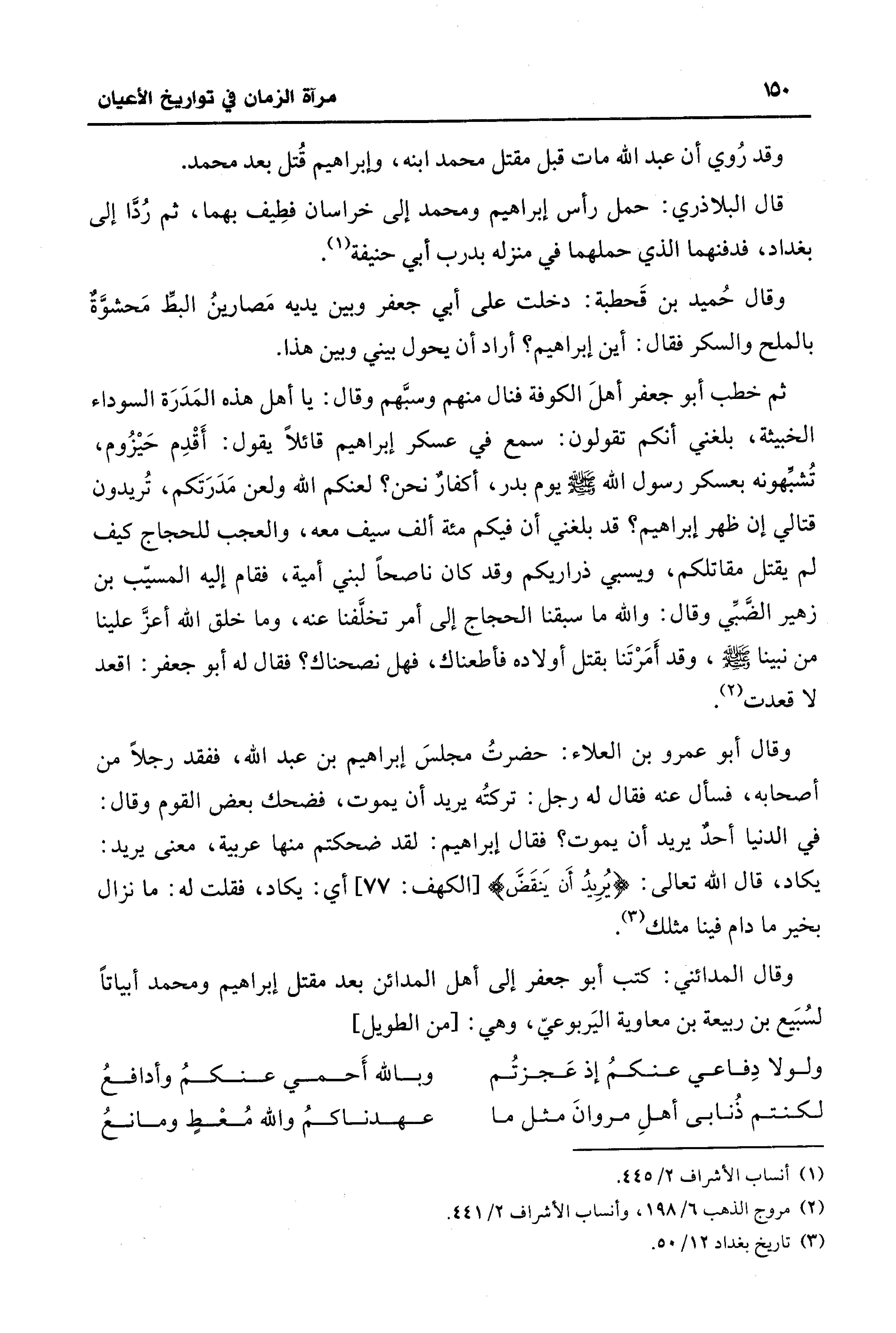 وقال المدائنيّ: كتب أبو جعفر إلى أهل المدائن بعد مقتل إبراهيم ومحمَّد أبياتًا لسُبَيع بن ربيعة بن معاوية اليَربوعيّ، وهي: [من الطَّويل]