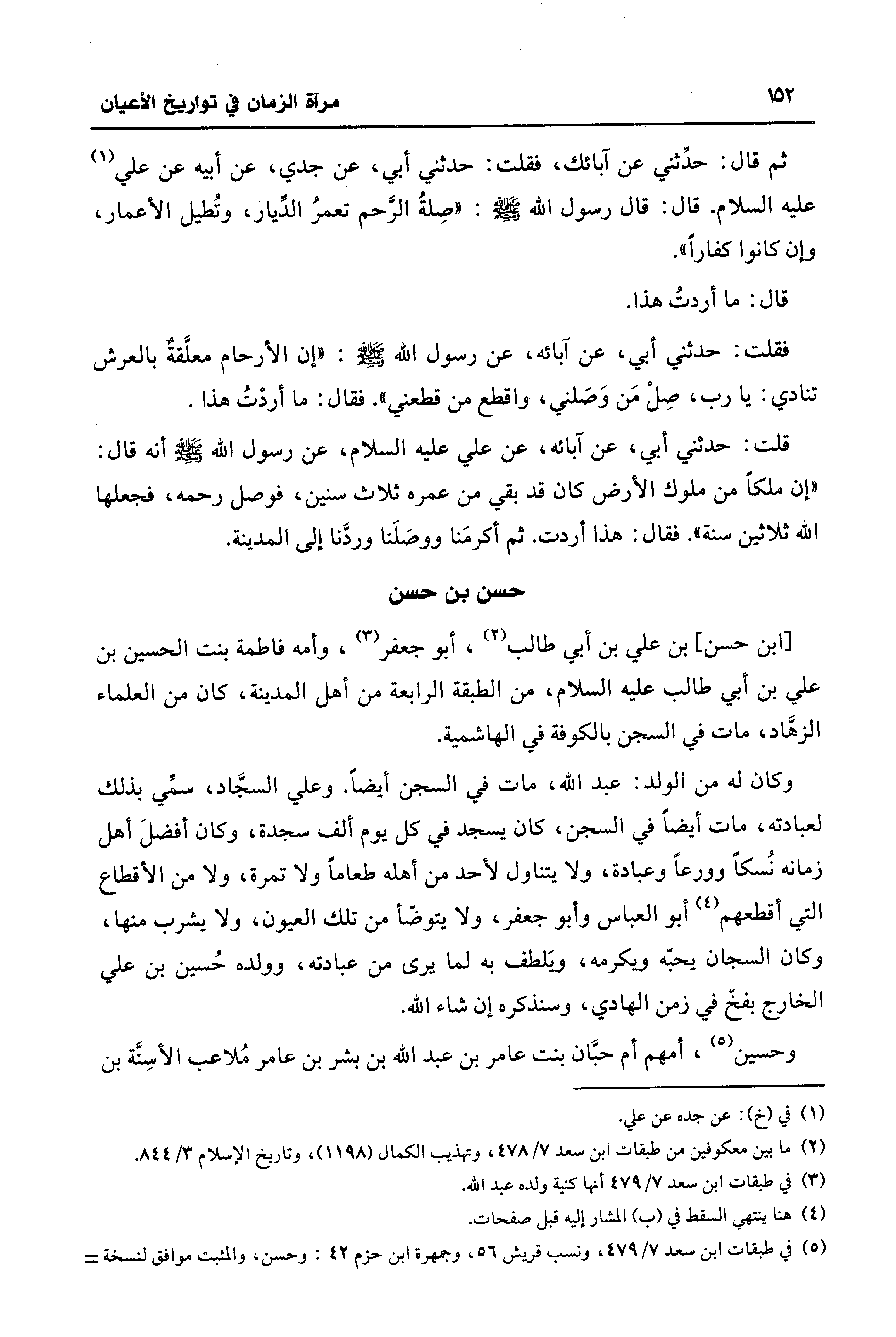 وكان له من الولد: عبد الله، مات في السجن أَيضًا. وعلي السجَّاد، سمِّي بذلك لعبادته، مات أَيضًا في السجن، كان يسجد في كل يوم أَلْف سجدة، وكان أفضلَ أهل زمانه نُسكًا وورعًا وعبادة، ولا يتناول لأحد من أهله طعامًا ولا تمرة، ولا من الأقطاع التي أقطعهم (¬4) أبو العباس وأبو جعفر، ولا يتوضّأ من تلك العيون، ولا يشرب منها، وكان السجان يحبّه ويكرمه، ويَلطف به لما يرى من عبادته، وولده حُسين بن عليّ الخارج بفخّ في زمن الهادي، وسنذكره إن شاء الله.