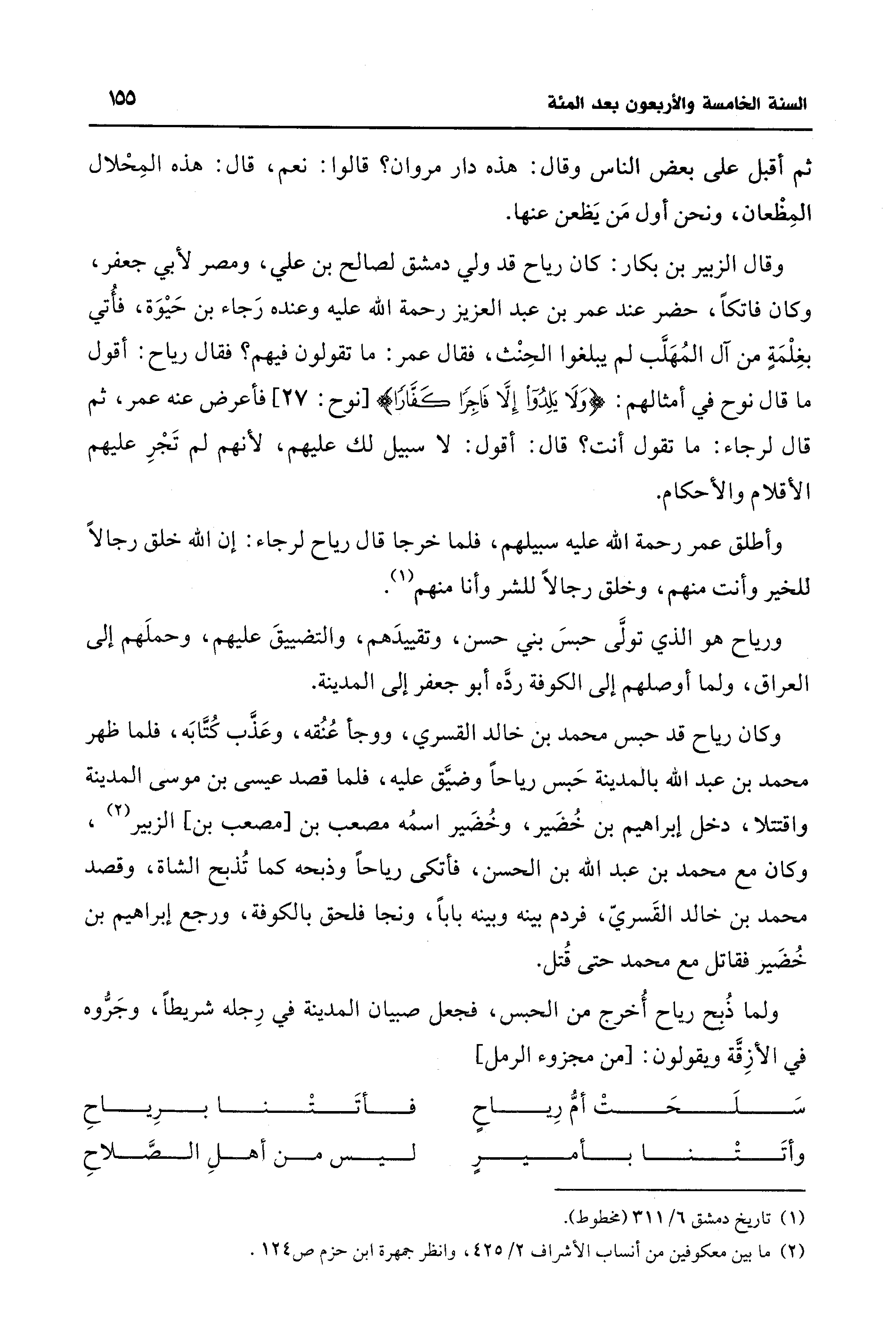 وكان رياح قد حبس محمد بن خالد القسري، ووجأ عُنُقه، وعَذَّب كُتَّابَه، فلما ظهر محمد بن عبد الله بالمدينة حَبس رياحًا وضيَّق عليه، فلما قصد عيسى بن موسى المدينة واقتتلا، دخل إبراهيم بن خُضير، وخُضَير اسمُه مصعب بن [مصعب بن] الزبير (¬2)، وكان مع محمد بن عبد الله بن الحسن، فأتكى رياحًا وذبحه كما تُذبح الشاة، وقصد محمد بن خالد القَسريّ، فردم بينه وبينه بابًا، ونجا فلحق بالكوفة، ورجع إبراهيم بن خُضَير فقاتل مع محمد حتى قُتل.