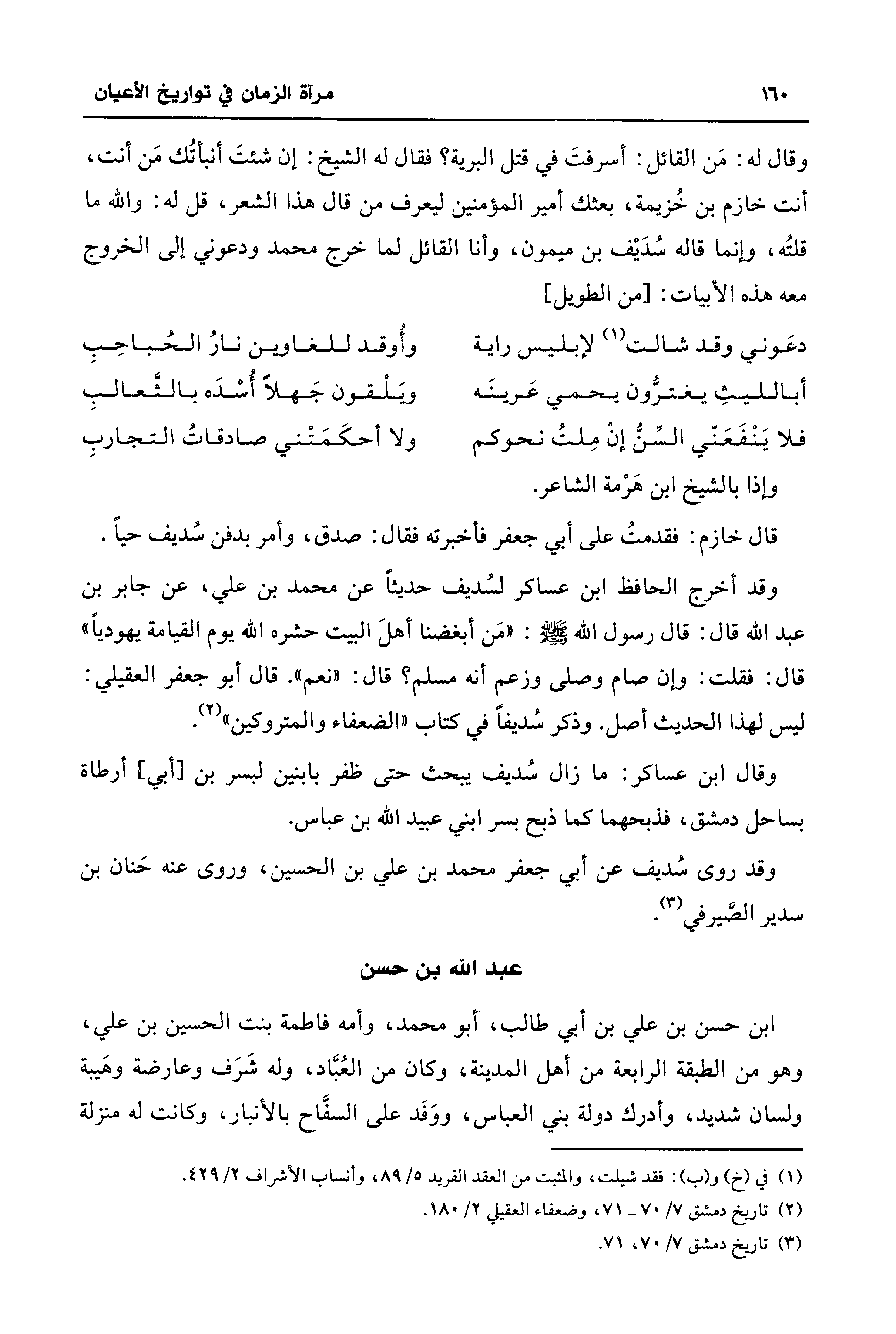 وقد أخرج الحافظ ابن عساكر لسُديف حديثًا عن محمد بن علي، عن جابر بن عبد الله قال: قال رسول الله - صلى الله عليه وسلم -: "مَن أبغضنا أهلَ البيت حشره الله يوم القيامة يهوديًّا" قال: فقلت: وإن صام وصلى وزعم أنه مسلم؟ قال: "نعم". قال أبو جعفر العقيلي: ليس لهذا الحديث أصل. وذكر سُديفًا في كتاب "الضعفاء والمتروكين" (¬2).