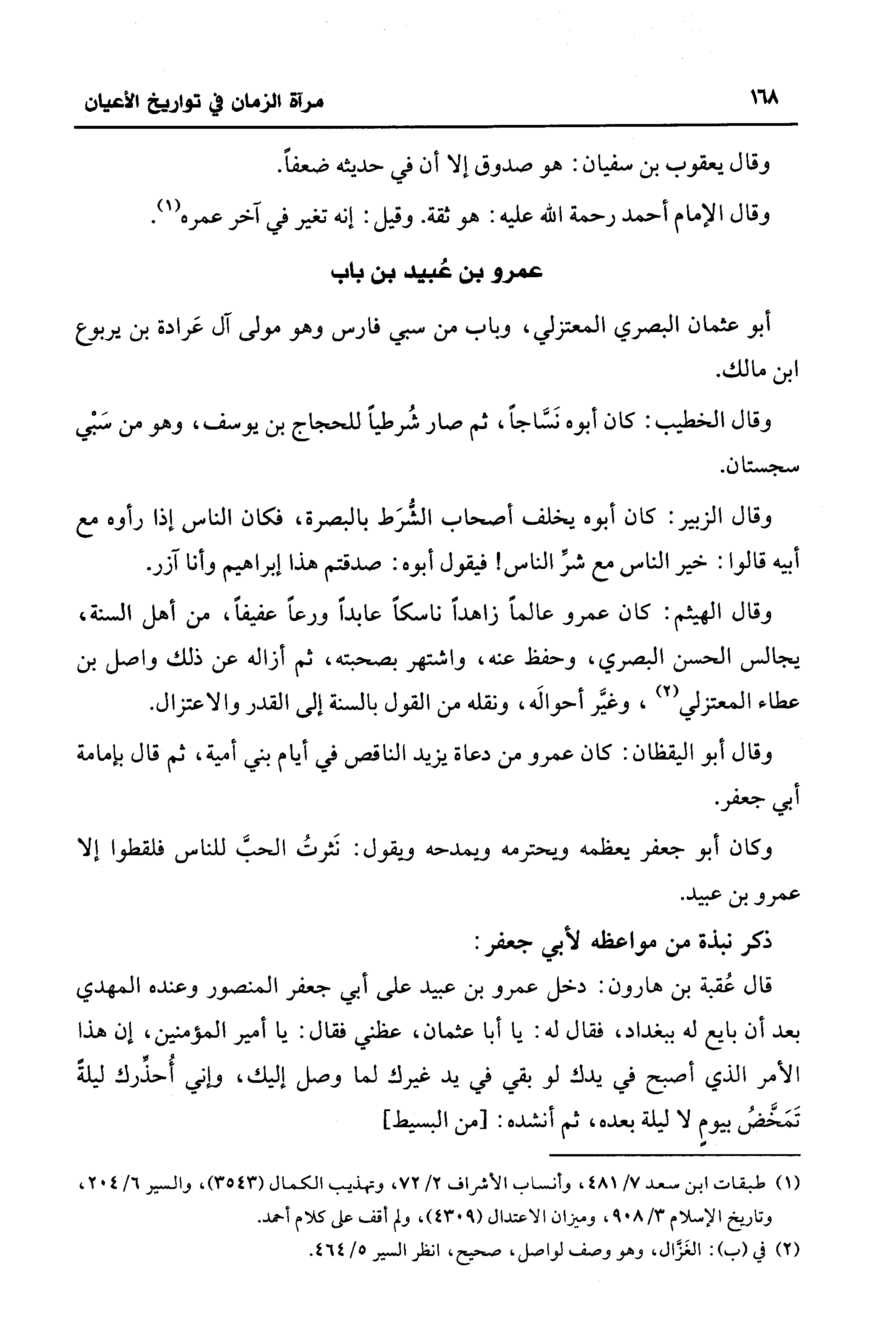 وقال الهيثم: كان عمرو عالمًا زاهدًا ناسكًا عابدًا ورعًا عفيفًا، من أهل السنة، يجالس الحسن البصري، وحفظ عنه، واشتهر بصحبته، ثم أزاله عن ذلك واصل بن عطاء المعتزلي (¬2)، وغيَّر أحواله، ونقله من القول بالسنة إلى الاقدر والاعتزال.