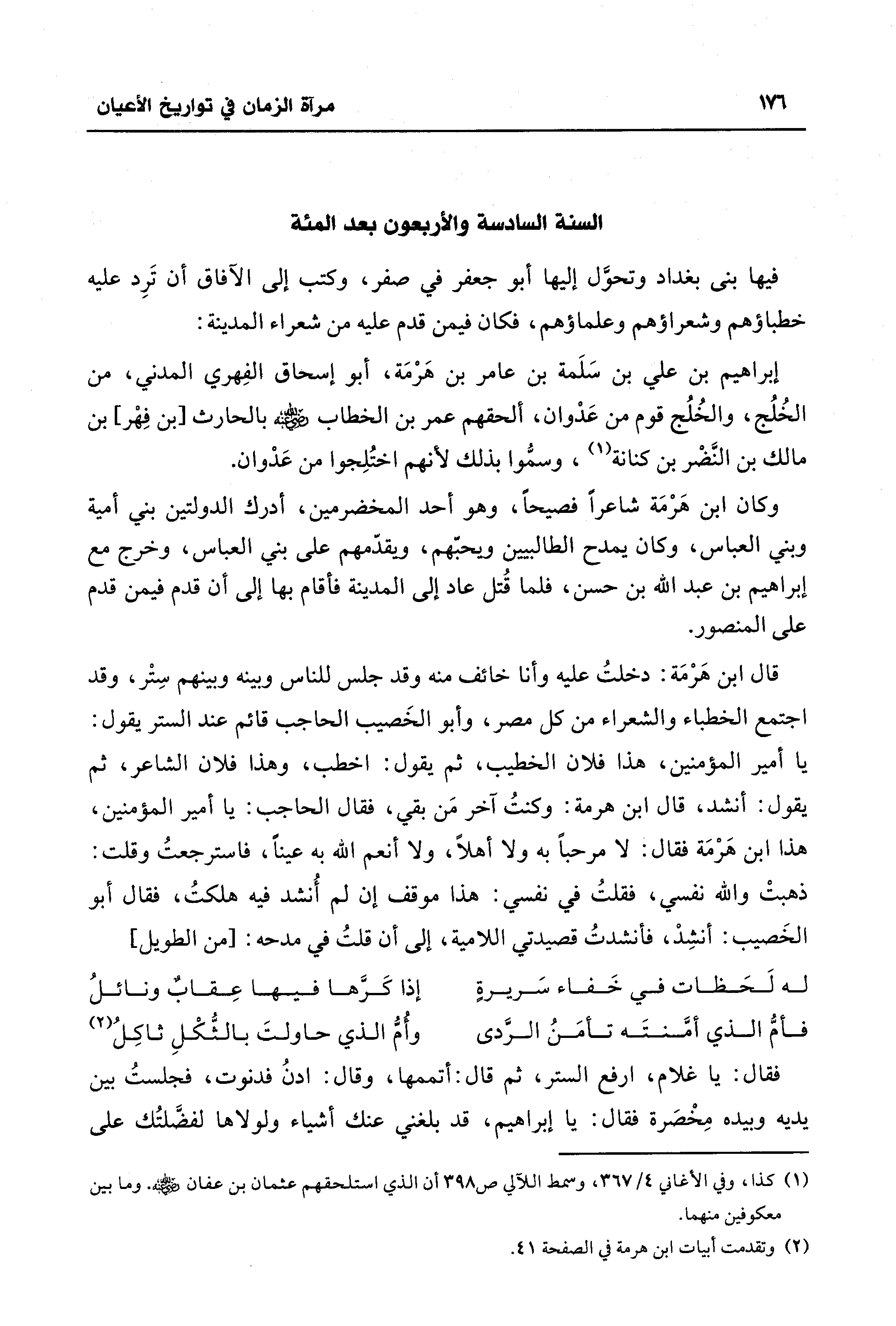 فيها بنى بغداد وتحوَّل إليها أبو جعفر في صفر، وكتب إلى الآفاق أن تَرِد عليه خطباؤهم وشعراؤهم وعلماؤهم، فكان فيمن قدم عليه من شعراء المدينة: