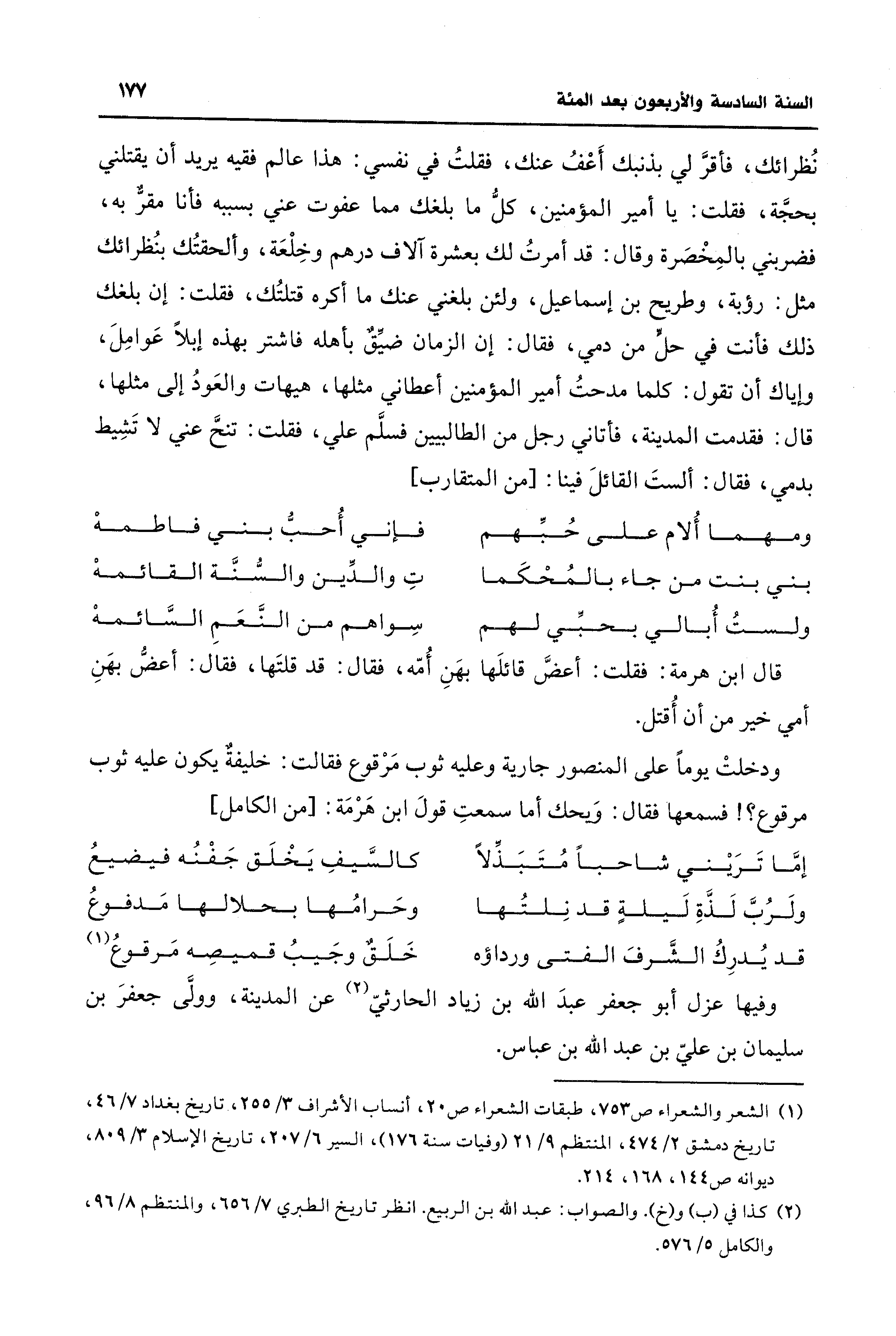 نُظرائك، فأقرَّ لي بذنبك أَعْفُ عنك، فقلتُ في نفسي: هذا عالم فقيه يريد أن يقتلني بحجَّة، فقلت: يا أمير المؤمنين، كلُّ ما بلغك مما عفوت عني بسببه فأنا مقرٌّ به، فضربني بالمِخْصَرة وقال: قد أمرتُ لك بعشرة آلاف درهم وخِلْعَة، وألحقتُك بنُظرائك مثل: رؤبة، وطريح بن إسماعيل، ولئن بلغني عنك ما أكره قتلتُك، فقلت: إن بلغك ذلك فأنت في حلٍّ من دمي، فقال: إن الزمان ضيِّق بأهله فاشتر بهذه إبلًا عَوامِلَ، وإياك أن تقول: كلما مدحتُ أمير المؤمنين أعطاني مثلها، هيهات والعَودُ إلى مثلها، قال: فقدمت المدينة، فأتاني رجل من الطالبيين فسلَّم علي، فقلت: تنحَّ عني لا تَشِيط بدمي، فقال: ألستَ القائلَ فينا: [من المتقارب]