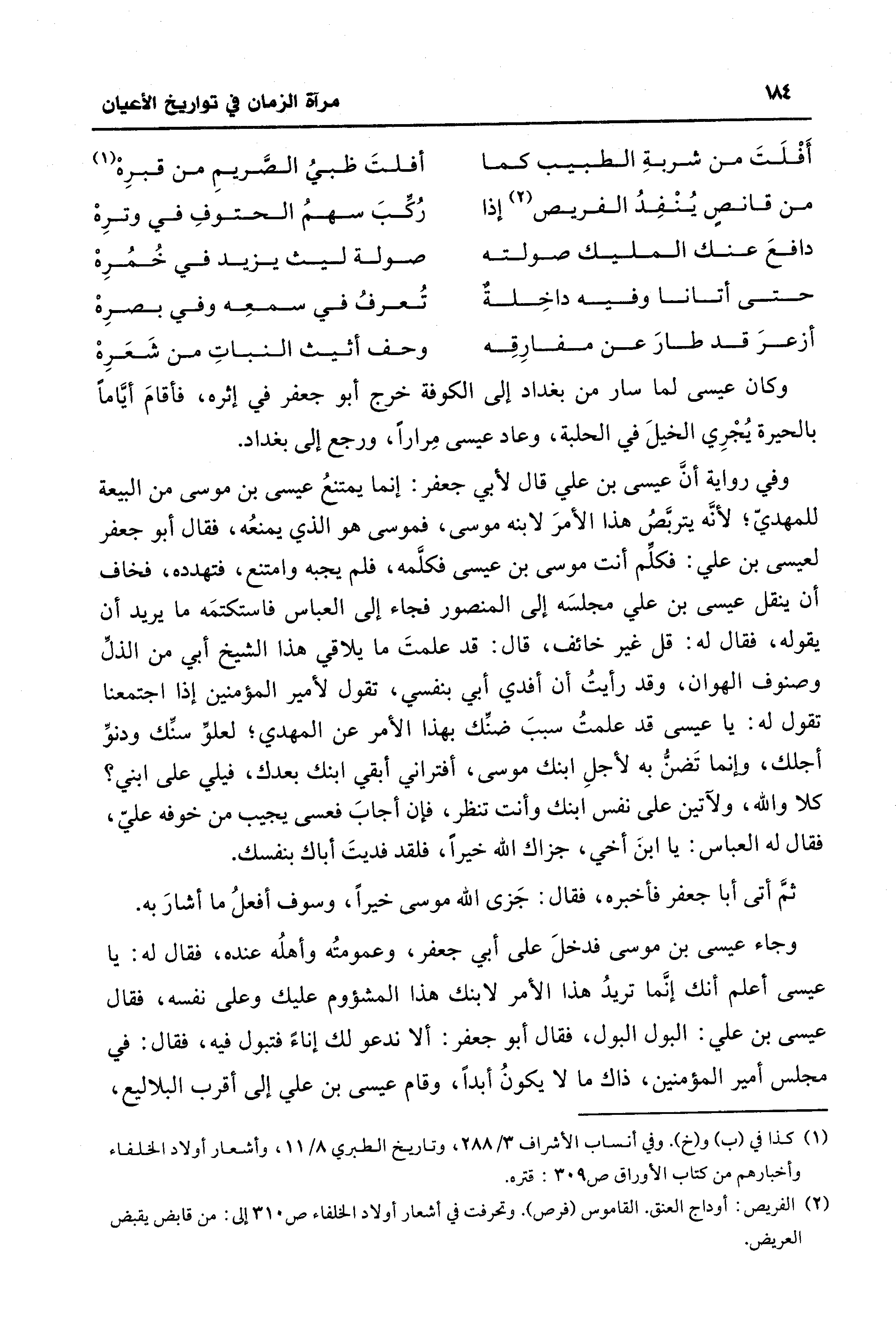 وجاء عيسى بن موسى فدخلَ على أبي جعفر، وعمومتُه وأهلُه عنده، فقال له: يا عيسى أعلم أنك إنَّما تريدُ هذا الأمر لابنك هذا المشؤوم عليك وعلى نفسه، فقال عيسى بن علي: البول البول، فقال أبو جعفر: ألا ندعو لك إناء فتبول فيه، فقال: في مجلس أمير المؤمنين، ذاك ما لا يكونُ أبدًا، وقام عيسى بن علي إلى أقرب البلاليع،