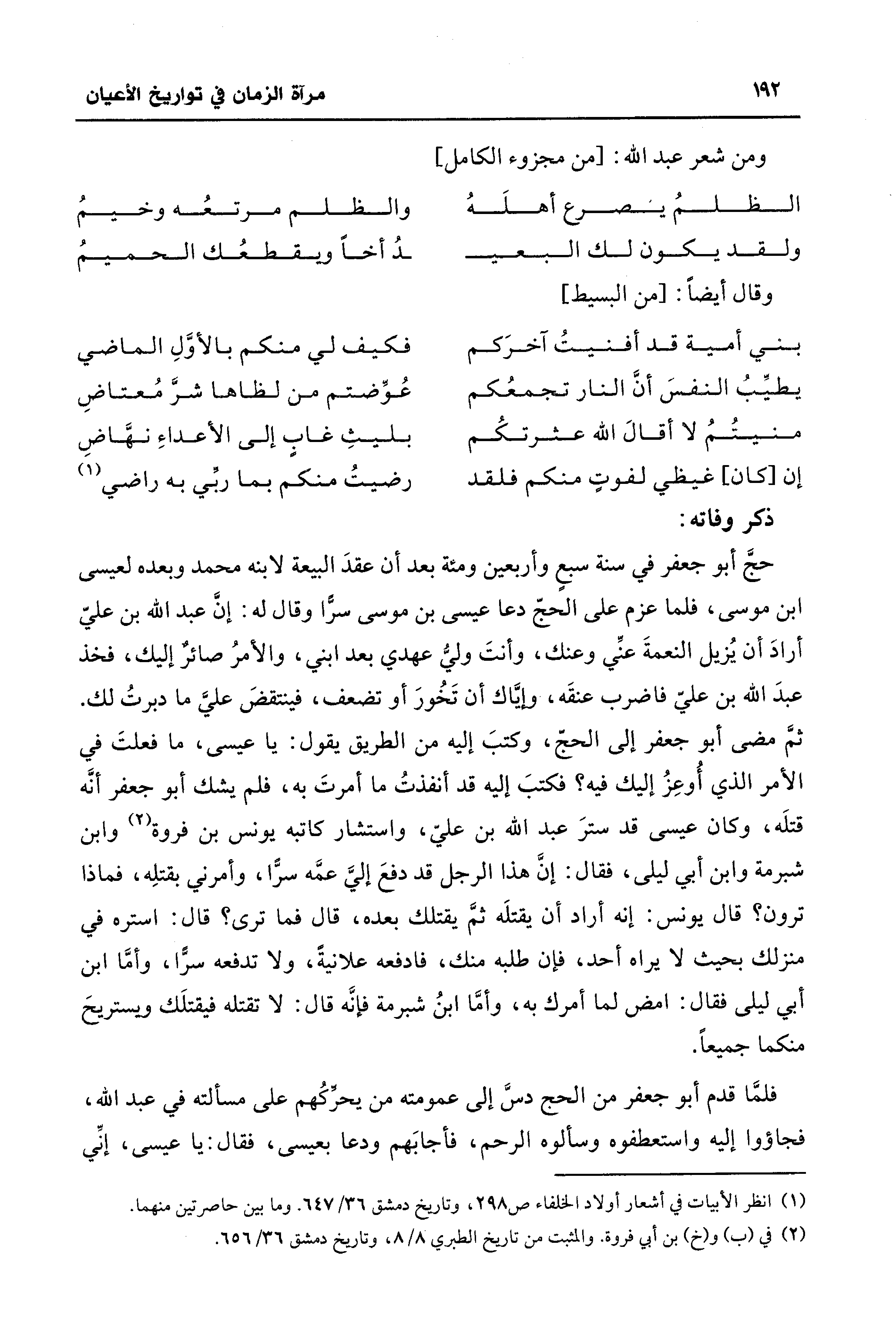 حجَّ أبو جعفر في سنة سبع وأربعين ومئة بعد أن عقدَ البيعة لابنه محمد وبعده لعيسى بن موسى، فلما عزم على الحجّ دعا عيسى بن موسى سرًّا وقال له: إنَّ عبد الله بن عليّ أرادَ أن يُزيل النعمةَ عنِّي وعنك، وأنتَ وليُّ عهدي بعد ابني، والأمرُ صائر إليك، فخذ عبدَ الله بن عليّ فاضرب عنقَه، وإيَّاك أن تَخُورَ أو تضعف، فينتقضَ على ما دبرتُ لك. ثمَّ مضى أبو جعفر إلى الحج، وكتبَ إليه من الطريق يقول: يا عيسى، ما فعلتَ في الأمر الذي أُوعِزُ إليك فيه؟ فكتبَ إليه قد أنفذتُ ما أمرتَ به، فلم يشك أبو جعفر أنَّه قتلَه، وكان عيسى قد سترَ عبد الله بن عليّ، واستشار كاتبه يونس بن فروة (¬2) وابن شبرمة وابن أبي ليلى، فقال: إنَّ هذا الرجل قد دفعَ إليَّ عمَّه سرًّا، وأمرني بقتلِه، فماذا ترون؟ قال يونس: إنه أراد أن يقتلَه ثم يقتلك بعده، قال فما ترى؟ قال: استره في منزلك بحيث لا يراه أحد، فإن طلبه منك، فادفعه علانيةً، ولا تدفعه سرًّا، وأمَّا ابن أبي ليلى فقال: امض لما أمرك به، وأمَّا ابنُ شبرمة فإنَّه قال: لا تقتله فيقتلَك ويستريحَ منكما جميعًا.
