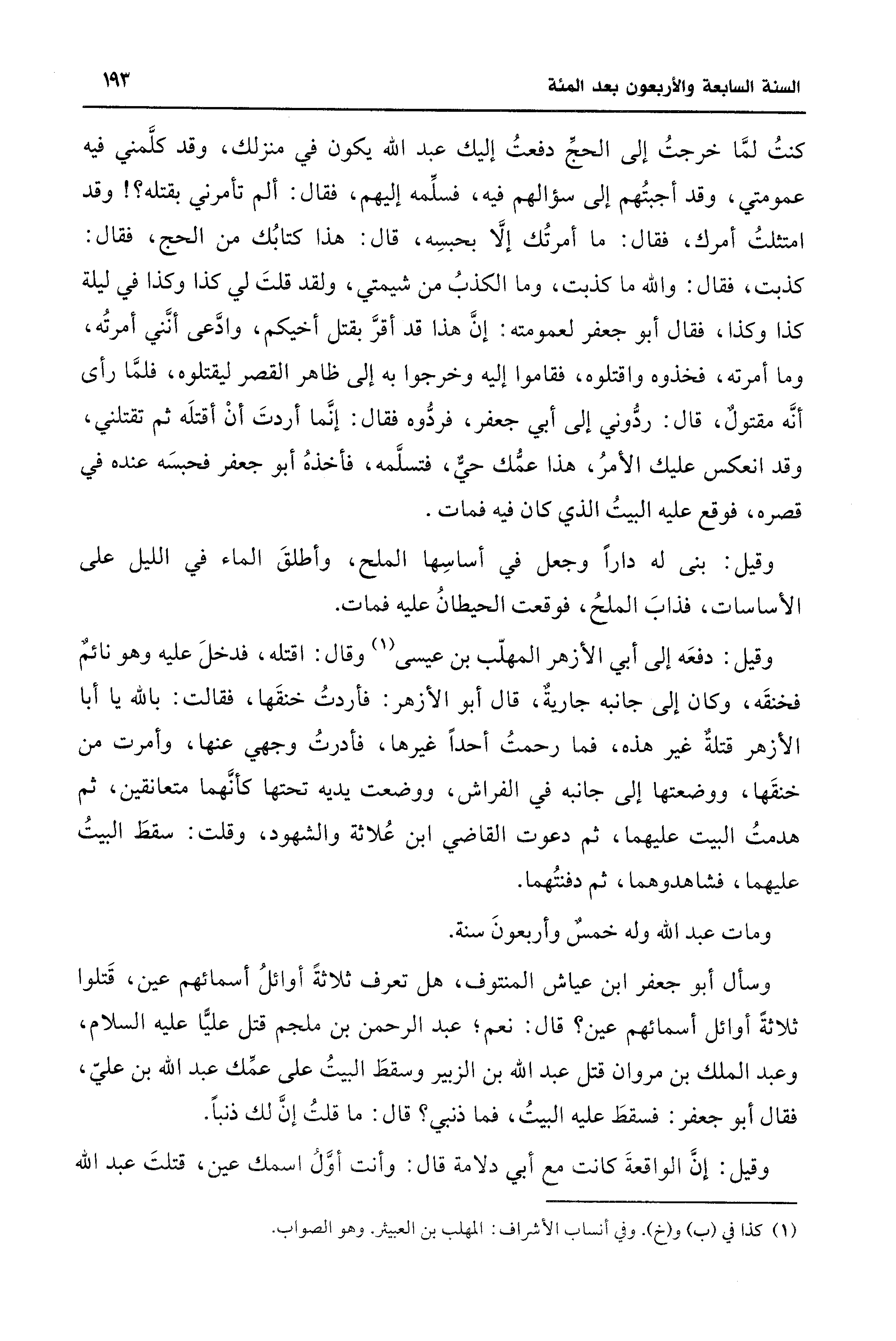 وسأل أبو جعفر بن عياش المنتوف، هل تعرف ثلاثةً أوائلُ أسمائهم عين، قَتلوا ثلاثةً أوائل أسمائهم عين؟ قال: نعم، عبد الرحمن بن ملجم قتل عليًّا - عليه السلام -، وعبد الملك بن مروان قتل عبد الله بن الزبير وسقطَ البيتُ على عمِّك عبد الله بن عليّ، فقال أبو جعفر: فسقطَ عليه البيتُ، فما ذنبي؟ قال: ما قلت إنَّ لك ذنبًا.