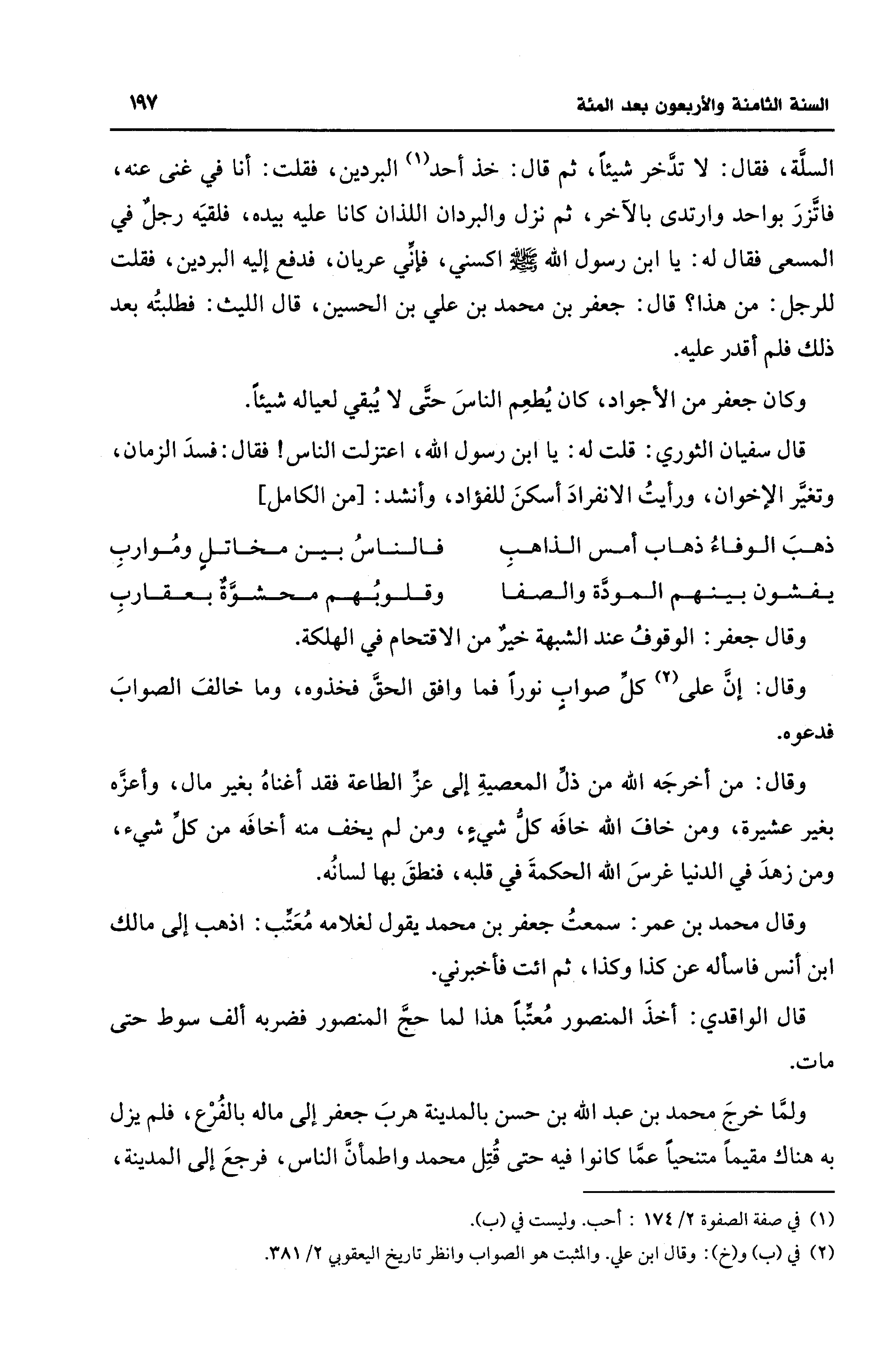 السلَّة، فقال: لا تدَّخر شيئًا، ثم قال: خذ أحد (¬1) البردين، فقلت: أنا في غنى عنه، فاتَّزرَ بواحد وارتدى بالآخر، ثم نزل والبردان اللذان كانا عليه بيده، فلقيَه رجلٌ في المسعى فقال له: يا ابن رسول الله - صلى الله عليه وسلم - اكسني، فإنِّي عريان، فدفع إليه البردين، فقلت للرجل: من هذا؟ قال: جعفر بن محمد بن علي بن الحسين، قال الليث: فطلبتُه بعد ذلك فلم أقدر عليه.