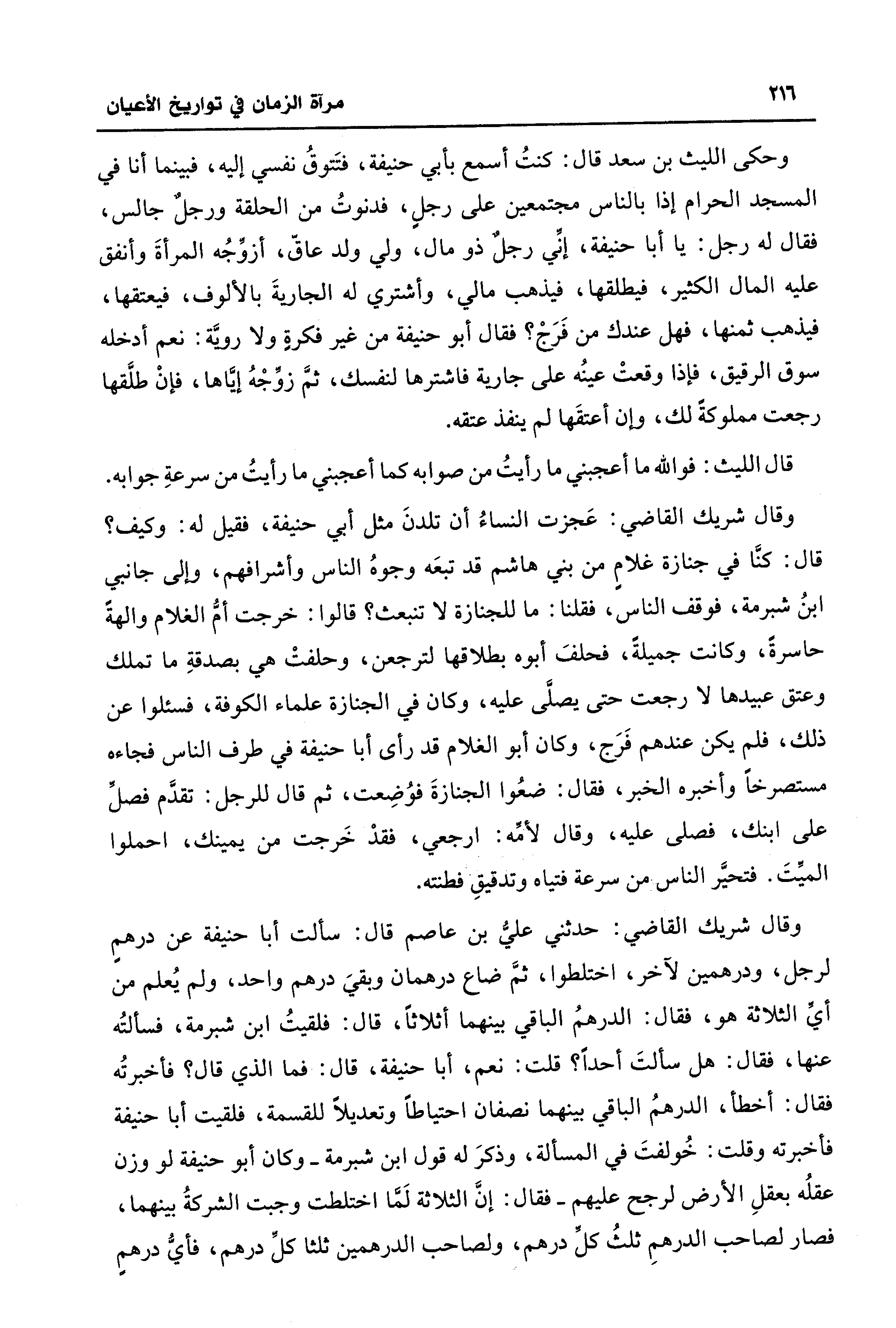 وقال شريك القاضي: حدثني عليُّ بن عاصم قال: سألت أبا حنيفة عن درهمٍ لرجل، ودرهمين لآخر، اختلطوا، ثمَّ ضاع درهمان وبقيَ درهم واحد، ولم يُعلم من أيِّ الثلاثة هو، فقال: الدرهمُ الباقي بينهما أثلاثًا، قال: فلقيتُ ابن شبرمة، فسألتُه عنها، فقال: هل سألتَ أحدًا؟ قلت: نعم، أبا حنيفة، قال: فما الذي قال؟ فأخبرتُه فقال: أخطأ، الدرهمُ الباقي بينهما نصفان احتياطًا وتعديلًا للقسمة، فلقيت أبا حنيفة فأخبرته وقلت: خُولفتَ في المسألة، وذكرَ له قول ابن شبرمة -وكان أبو حنيفة لو وزن عقلُه بعقلِ الأرض لرجح عليهم- فقال: إنَّ الثلاثة لَمَّا اختلطت وجبت الشركةُ بينهما، فصار لصاحب الدرهمِ ثلثُ كلِّ درهم، ولصاحب الدرهمين ثلثا كلِّ درهم، فأيُّ درهمٍ