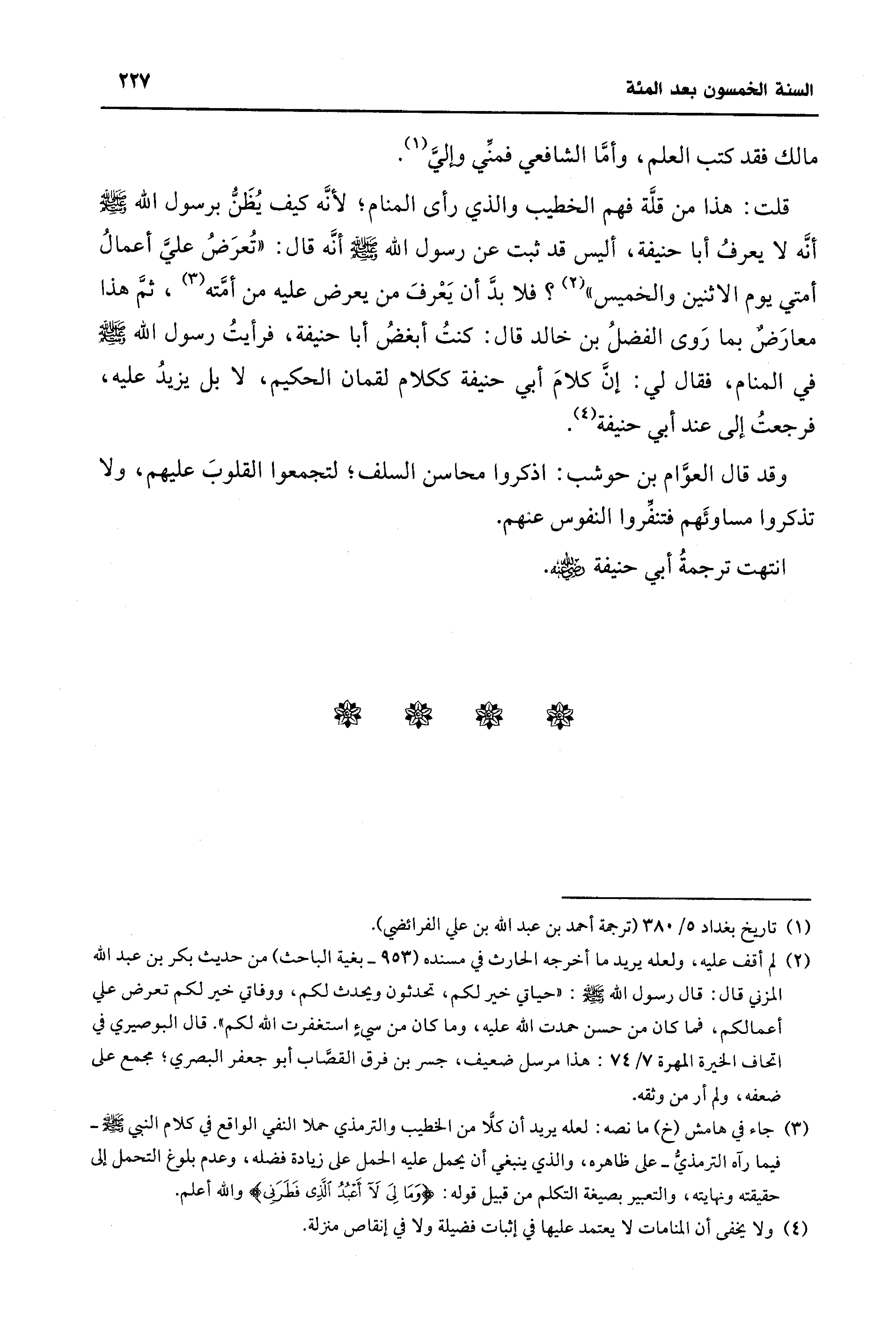 قلت: هذا من قلَّة فهم الخطيب والذي رأى المنام؛ لأنَّه كيف يُظَنُّ برسول الله - صلى الله عليه وسلم - أنَّه لا يعرفُ أبا حنيفة، أليس قد ثبت عن رسول الله - صلى الله عليه وسلم - أنَّه قال: "تُعرَضُ عليَّ أعمالُ أمتي يوم الاثنين والخميس" (¬2)؟ فلا بدَّ أن يَعْرفَ من يعرض عليه من أمَّته (¬3)، ثمَّ هذا معارَضٌ بما رَوى الفضلُ بن خالد قال: كنتُ أبغضُ أبا حنيفة، فرأيتُ رسول الله - صلى الله عليه وسلم - في المنام، فقال لي: إنَّ كلامَ أبي حنيفة ككلام لقمان الحكيم، لا بل يزيدُ عليه، فرجعتُ إلى عند أبي حنيفة (¬4).