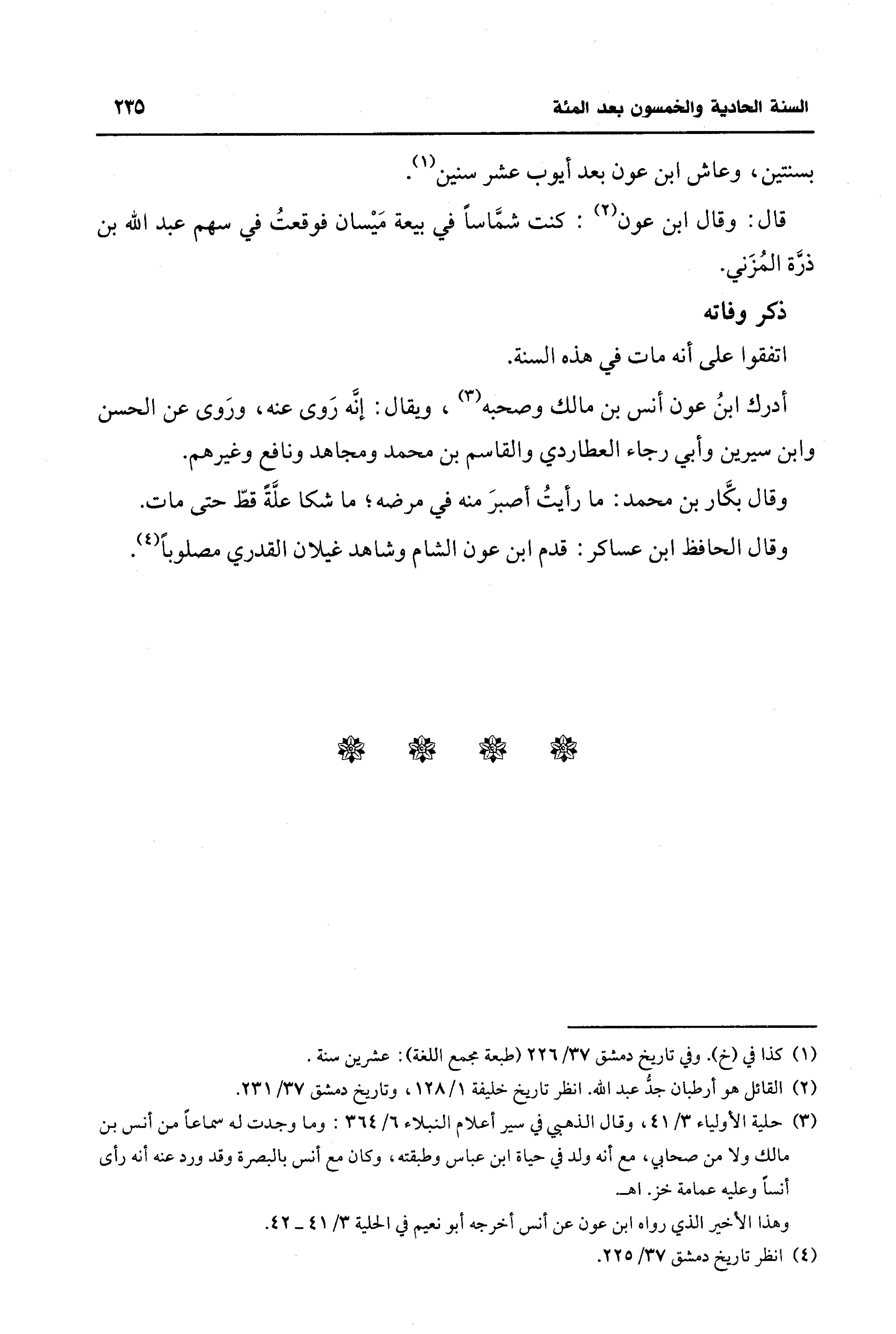 (¬3) حلية الأولياء 3/ 41، وقال الذهبي في سير أعلام النبلاء 6/ 364: وما وجدت له سماعًا من أنس بن مالك ولا من صحابي، مع أنه ولد في حياة ابن عباس وطبقته، وكان مع أنس بالبصرة وقد ورد عنه أنه رأى أنسًا وعليه عمامة خز. اهـ.