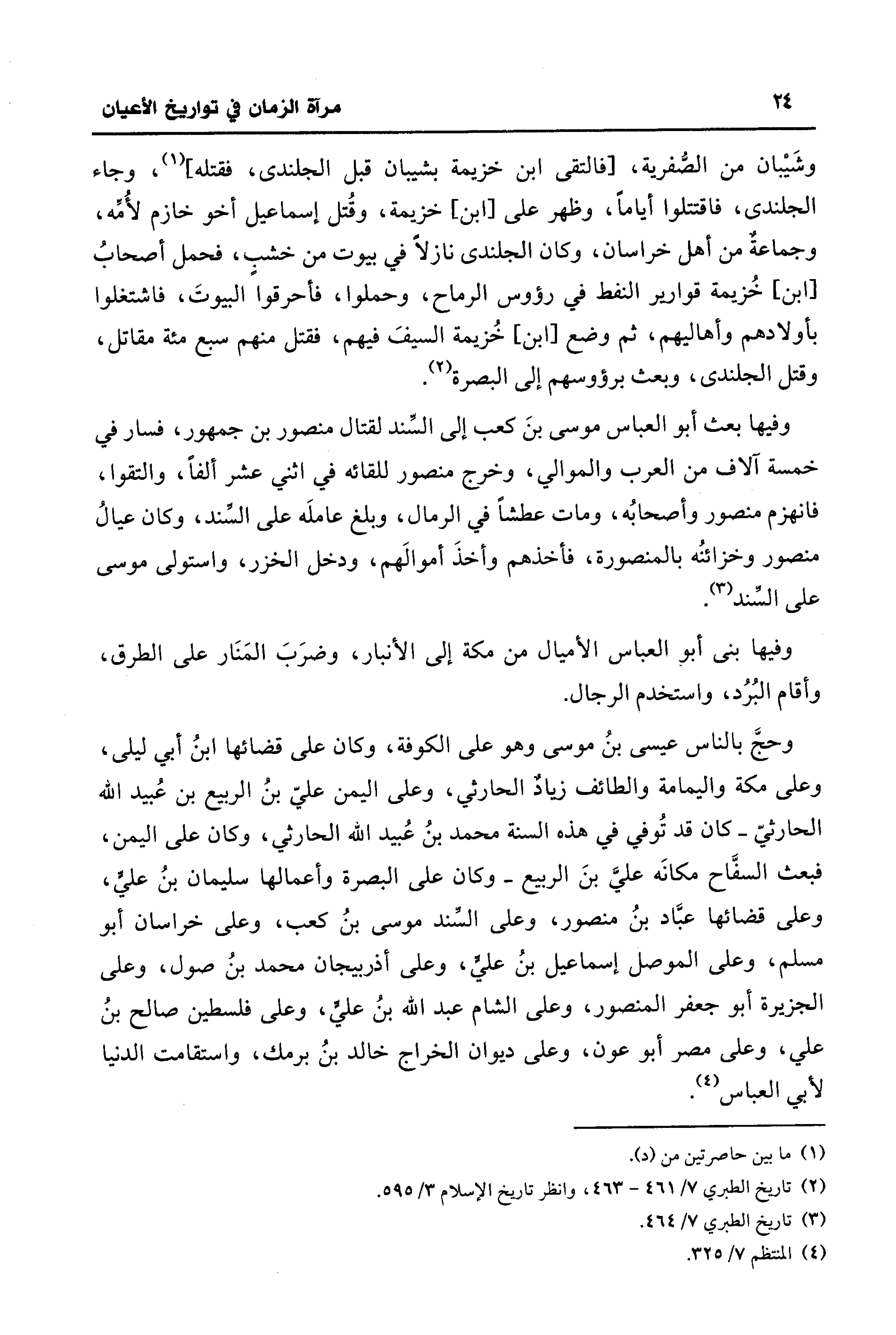 وفيها بعث أبو العباس موسى بنَ كعب إلى السِّند لقتال منصور بن جمهور، فسار في خمسة آلاف من العرب والموالي، وخرج منصور للقائه في اثني عشر ألفًا، والتقوا، فانهزم منصور وأصحابُه، ومات عطشًا في الرمال، وبلغ عاملَه على السند، وكان عيال منصور وخزائنُه بالمنصورة، فأخذهم وأخذَ أموالهم، ودخل الخزر، واستولى موسى على السند (¬3).