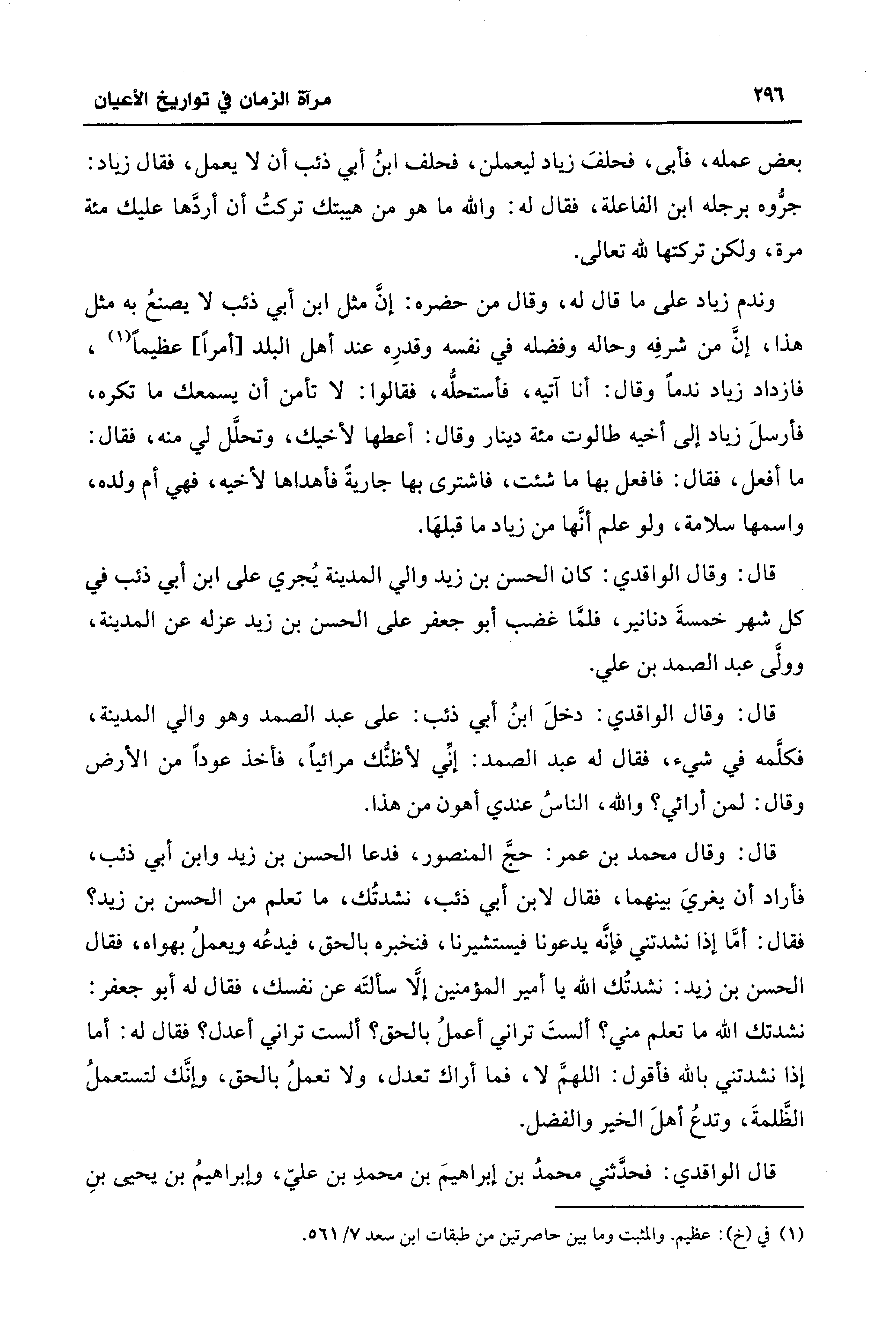 قال: وقال محمد بن عمر: حجَّ المنصور، فدعا الحسن بن زيد وابن أبي ذئب، فأراد أن يغريَ بينهما، فقال لابن أبي ذئب، نشدتُك، ما تعلم من الحسن بن زيد؟ فقال: أمَّا إذا نشدتني فإنَّه يدعونا فيستشيرنا، فنخبره بالحق، فيدعُه ويعملُ بهواه، فقال الحسن بن زيد: نشدتُك الله يا أمير المؤمنين إلَّا سألتَه عن نفسك، فقال له أبو جعفر: نشدتك الله ما تعلم مني؟ ألستَ تراني أعملُ بالحق؟ ألست تراني أعدل؟ فقال له: أما إذا نشدتني بالله فأقول: اللهمَّ لا، فما أراك تعدل، ولا تعملُ بالحق، وإنَّك لتستعملُ الظَّلمةَ، وتدعُ أهلَ الخير والفضل.