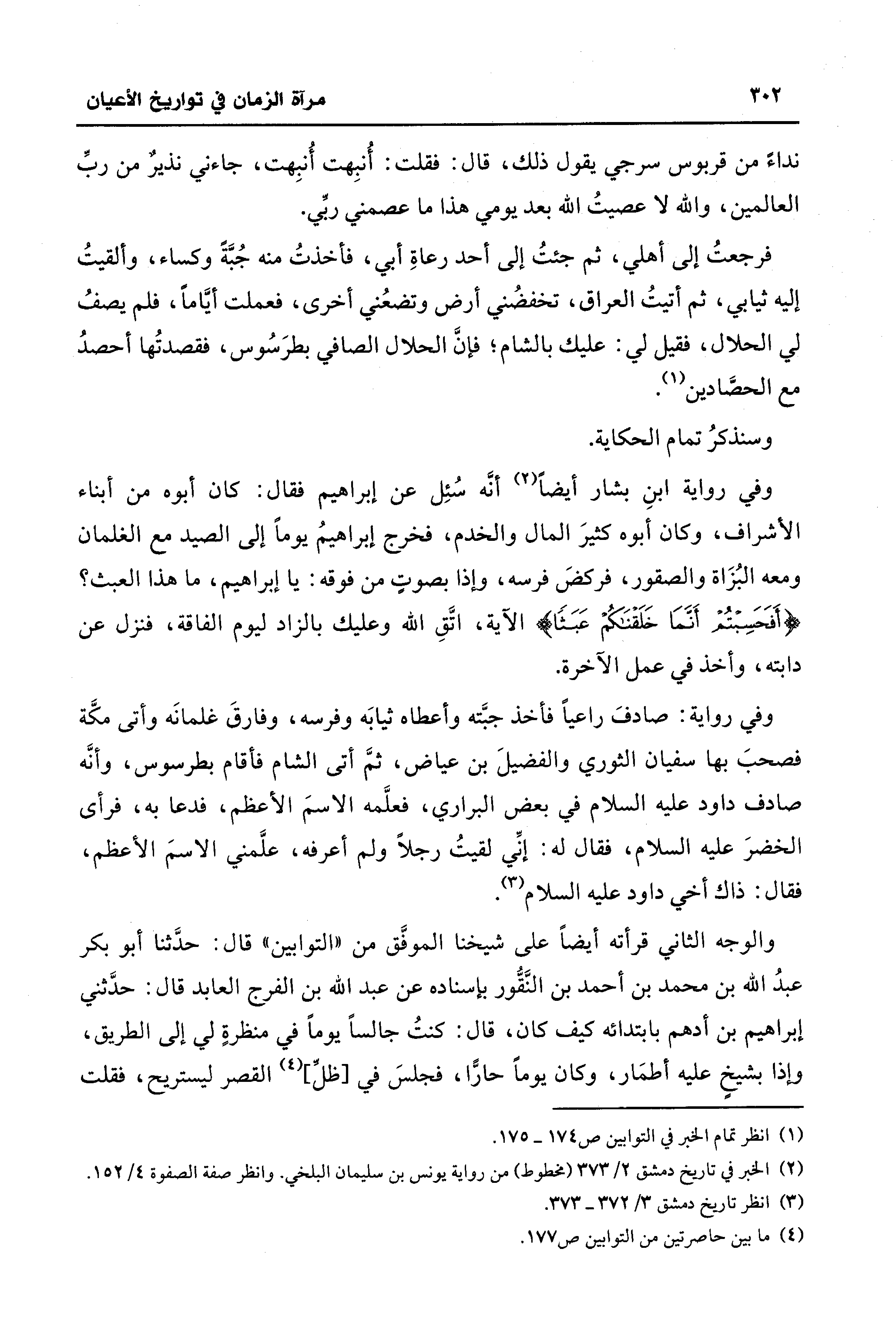 وفي رواية ابنِ بشار أيضًا (¬2) أنَّه سُئِل عن إبراهيم فقال: كان أبوه من أبناء الأشراف، وكان أبوه كثيرَ المال والخدم، فخرج إبراهيمُ يومًا إلى الصيد مع الغلمان ومعه البُزَاة والصقور، فركضَ فرسه، وإذا بصوتٍ من فوقه: يا إبراهيم، ما هذا العبث؛ ؟ {أَفَحَسِبْتُمْ أَنَّمَا خَلَقْنَاكُمْ عَبَثًا} الآية، اتَّقِ الله وعليك بالزاد ليوم الفاقة، فنزل عن دابته، وأخذ في عمل الآخرة.