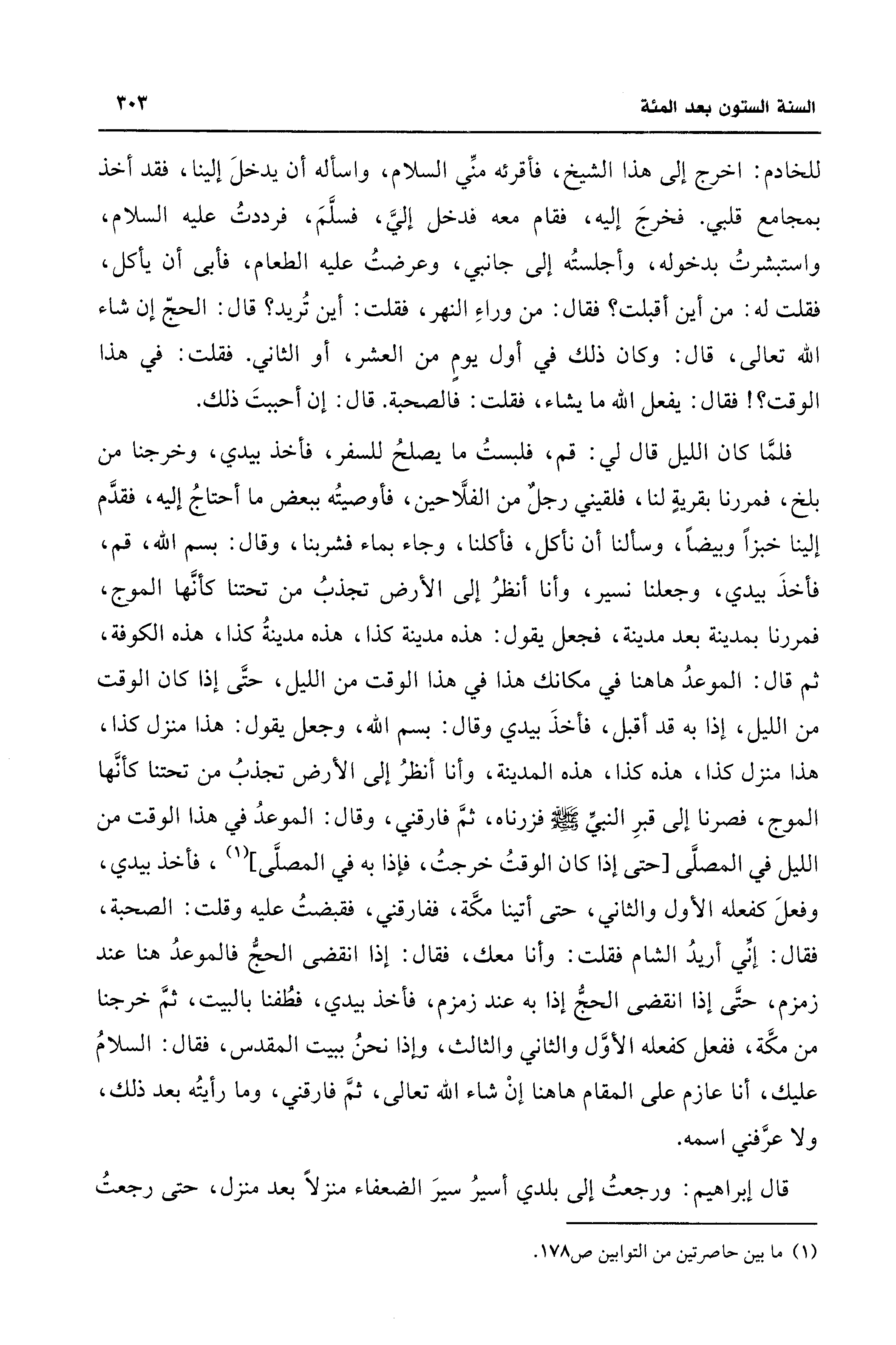 للخادم: اخرج إلى هذا الشيخ، فأقرئه منِّي السلام، واسأله أن يدخلَ إلينا، فقد أخذ بمجامع قلبي. فخرجَ إليه، فقام معه فدخل إليَّ، فسلَّمَ، فرددتُ - عليه السلام -، واستبشرتُ بدخوله، وأجلستُه إلى جانبي، وعرضتُ عليه الطعام، فأبى أن يأكل، فقلت له: من أين أقبلت؟ فقال: من وراءِ النهر، فقلت: أين تُريد؟ قال: الحجّ إن شاء الله تعالى، قال: وكان ذلك في أول يومٍ من العشر، أو الثاني. فقلت: في هذا الوقت؟ ! فقال: يفعل الله ما يشاء، فقلت: فالصحبة. قال: إن أحببتَ ذلك.