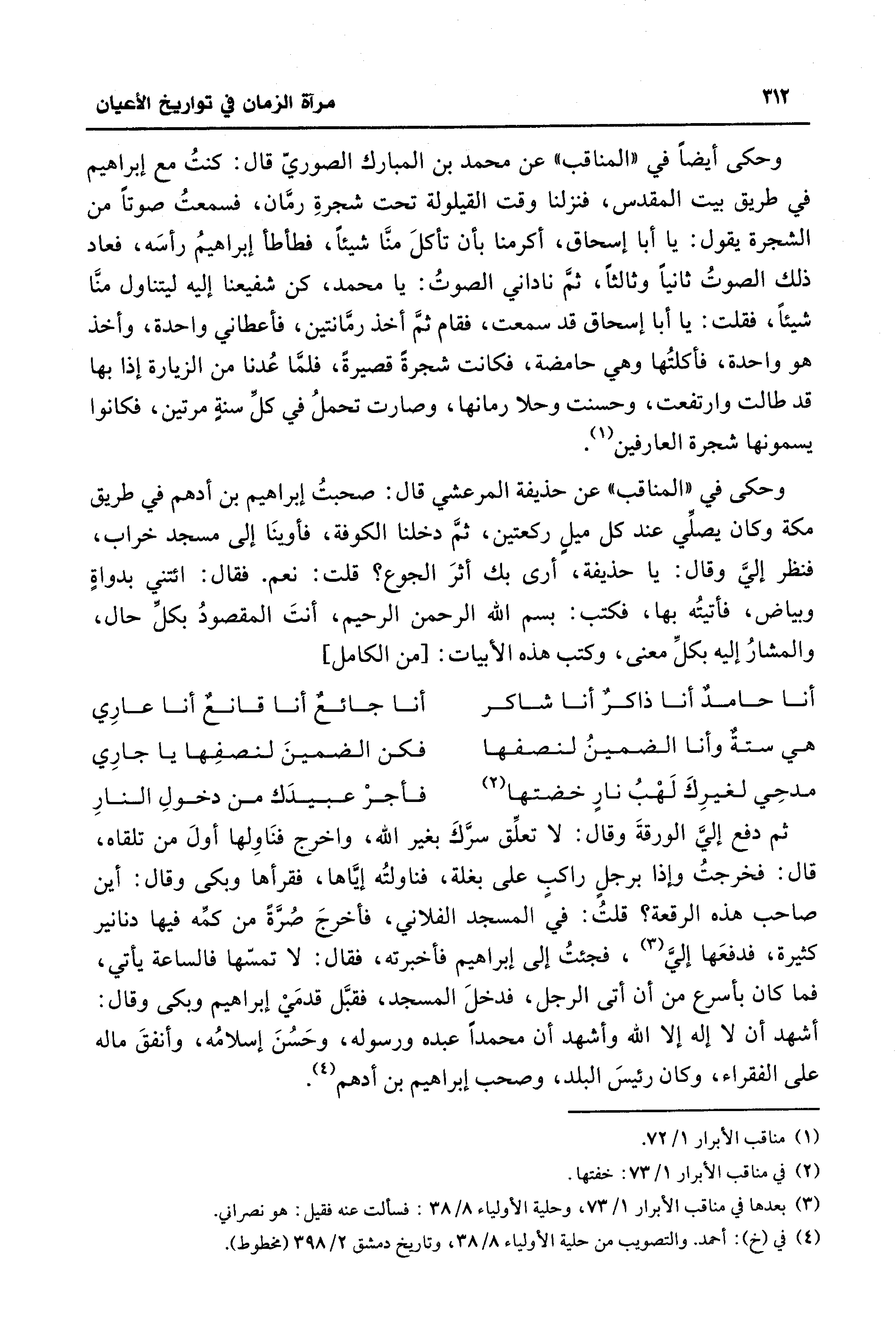 وحكى في "المناقب" عن حذيفة المرعشي قال: صحبتُ إبراهيم بن أدهم في طريق مكة وكان يصلِّي عند كل ميلٍ ركعتين، ثمَّ دخلنا الكوفة، فأوينَا إلى مسجد خراب، فنظر إليَّ وقال: يا حذيفة، أرى بك أثرَ الجوع؟ قلت: نعم. فقال: ائتني بدواةٍ وبياض، فأتيتُه بها، فكتب: بِسْمِ اللَّهِ الرَّحْمَنِ الرَّحِيمِ، أنتَ المقصودُ بكلِّ حال، والمشارُ إليه بكلِّ معنى، وكتب هذه الأبيات: [من الكامل]