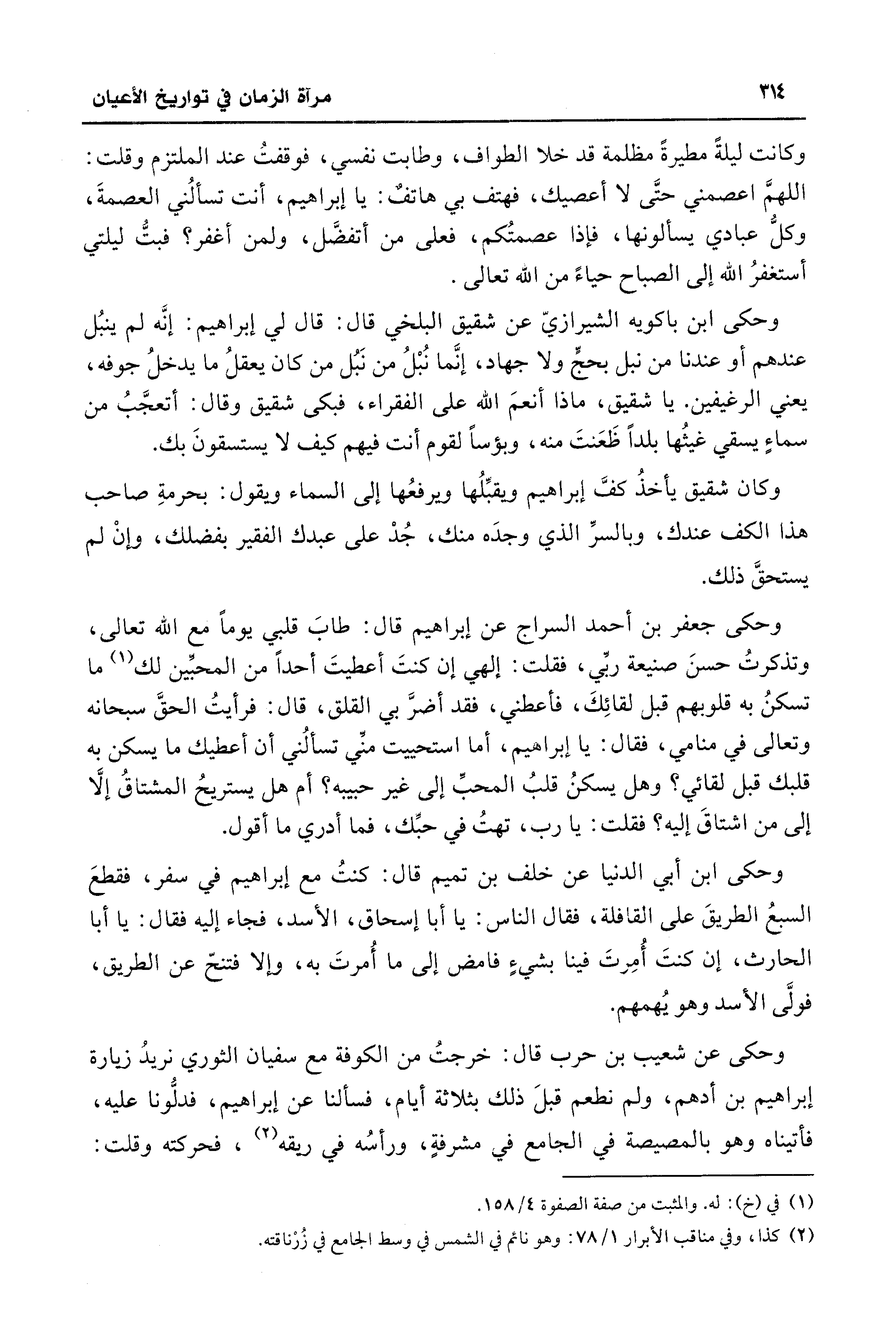 وحكى ابن باكويه الشيرازيّ عن شقيق البلخي قال: قال لي إبراهيم: إنَّه لم ينبُل عندهم أو عندنا من نبل بحجٍّ ولا جهاد، إنَّما نُبْلُ من نَبُل من كان يعقلُ ما يدخلُ جوفه، يعني الرغيفين. يا شقيق، ماذا أنعمَ الله على الفقراء، فبكى شقيق وقال: أتعجَّبُ من سماءٍ يسقي غيثُها بلدًا ظَعَنتَ منه، وبؤسًا لقوم أنت فيهم كيف لا يستسقونَ بك.