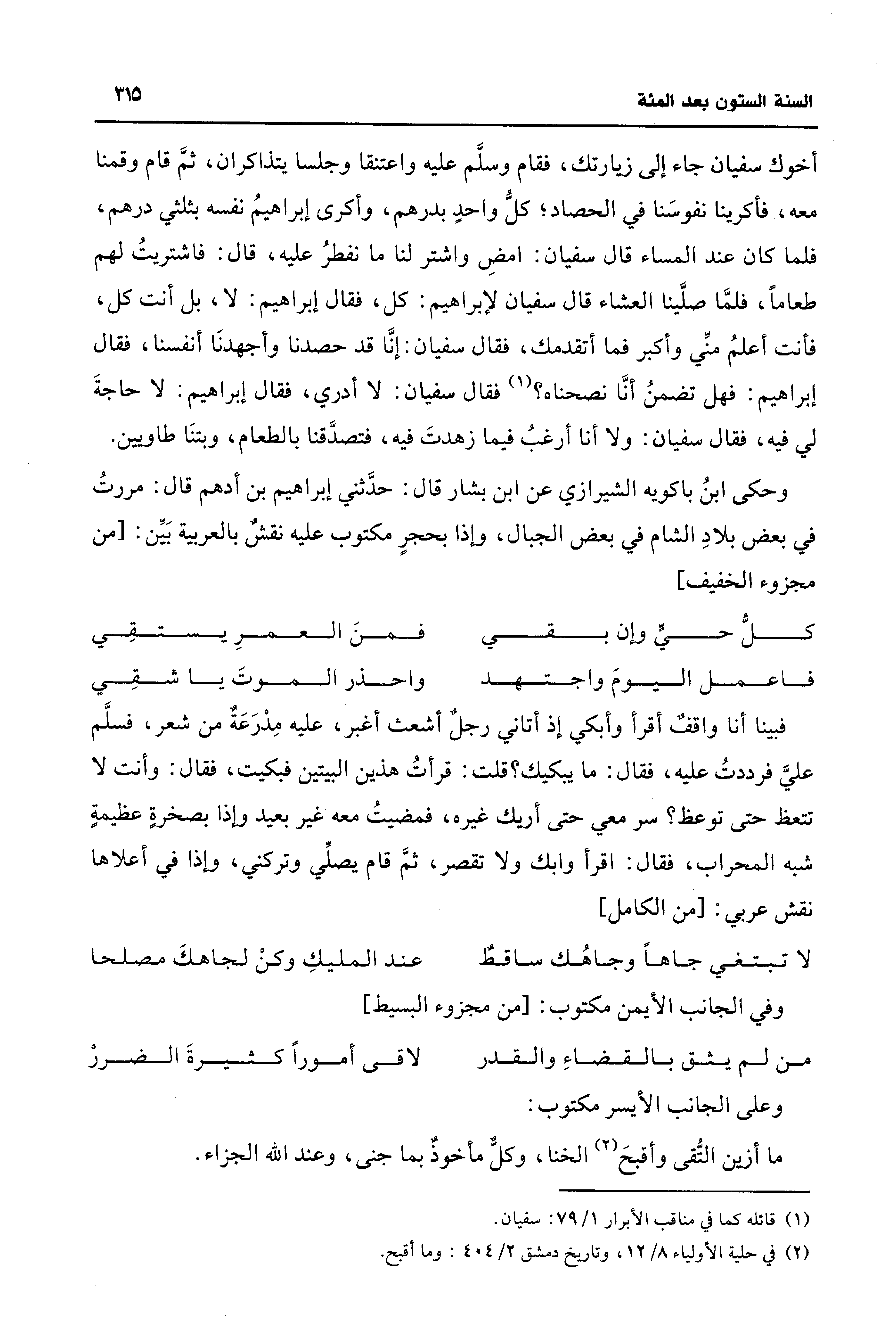 أخوك سفيان جاء إلى زيارتك، فقام وسلَّم عليه واعتنقا وجلسا يتذاكران، ثمَّ قام وقمنا معه، فأكرينا نفوسَنا في الحصاد؛ كلُّ واحدٍ بدرهم، وأكرى إبراهيمُ نفسه بثلثي درهم، فلما كان عند المساء قال سفيان: امضِ واشتر لنا ما نفطرُ عليه، قال: فاشتريتُ لهم طعامًا، فلمَّا صلَينا العشاء قال سفيان لإبراهيم: كل، فقال إبراهيم: لا، بل أنت كل، فأنت أعلمُ منِّي وأكبر فما أتقدمك، فقال سفيان: إنَّا قد حصدنا وأجهدنَا أنفسنا، فقال إبراهيم: فهل تضمنُ أنَّا نصحناه؟ (¬1) فقال سفيان: لا أدري، فقال إبراهيم: لا حاجةَ في فيه، فقال سفيان: ولا أنا أرغبُ فيما زهدتَ فيه، فتصدَّقنا بالطعام، وبتنَا طاويين.