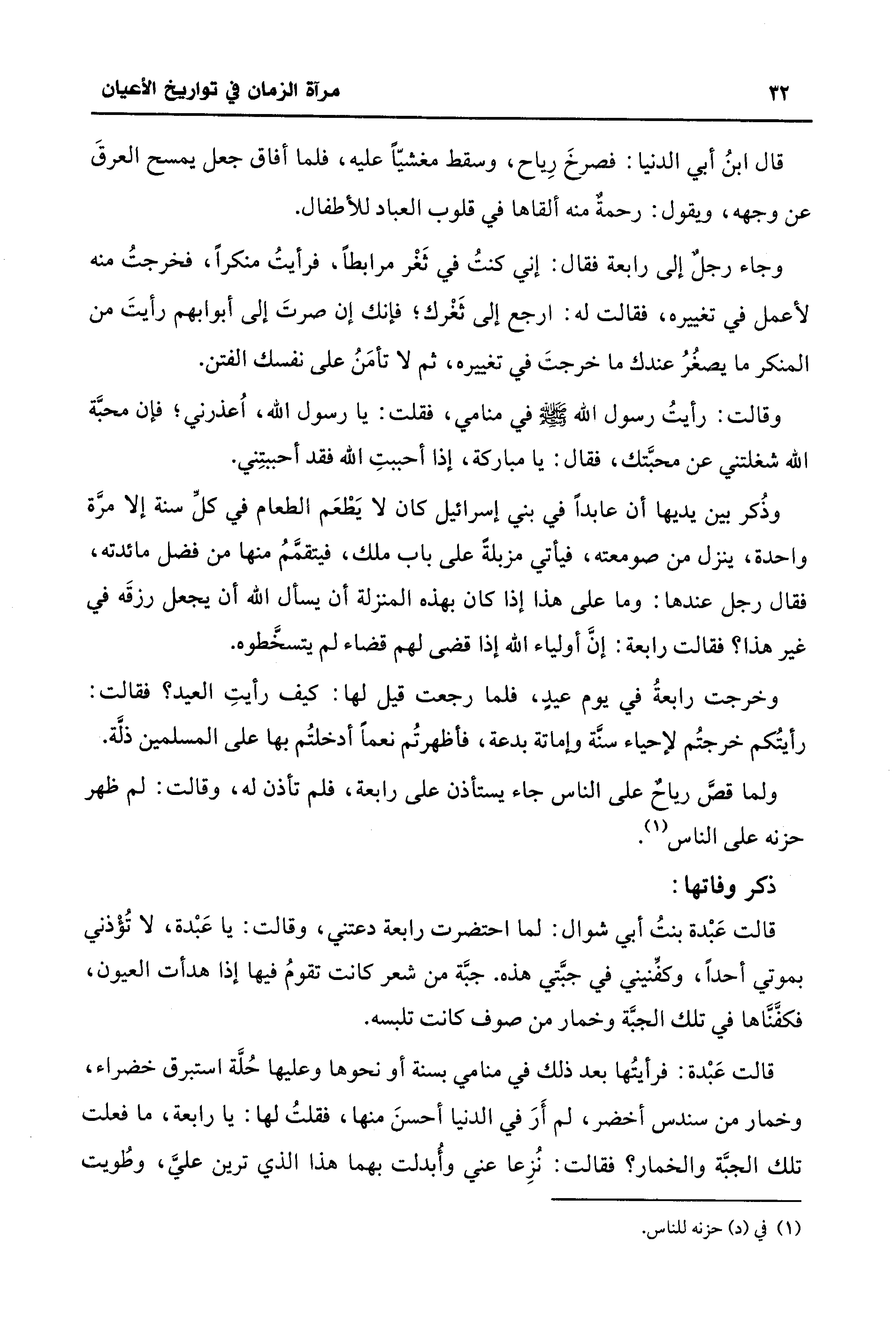 قالت عَبْدة: فرأيتُها بعد ذلك في منامي بسنة أو نحوها وعليها حُلَّة استبرق خضراء، وخمار من سندس أخضر، لم أَرَ في الدنيا أحسنَ منها، فقلتُ لها: يا رابعة، ما فعلت تلك الجبَّة والخمار؟ فقالت: نُزِعا عني وأُبدلت بهما هذا الذي ترين عليَّ، وطُويت