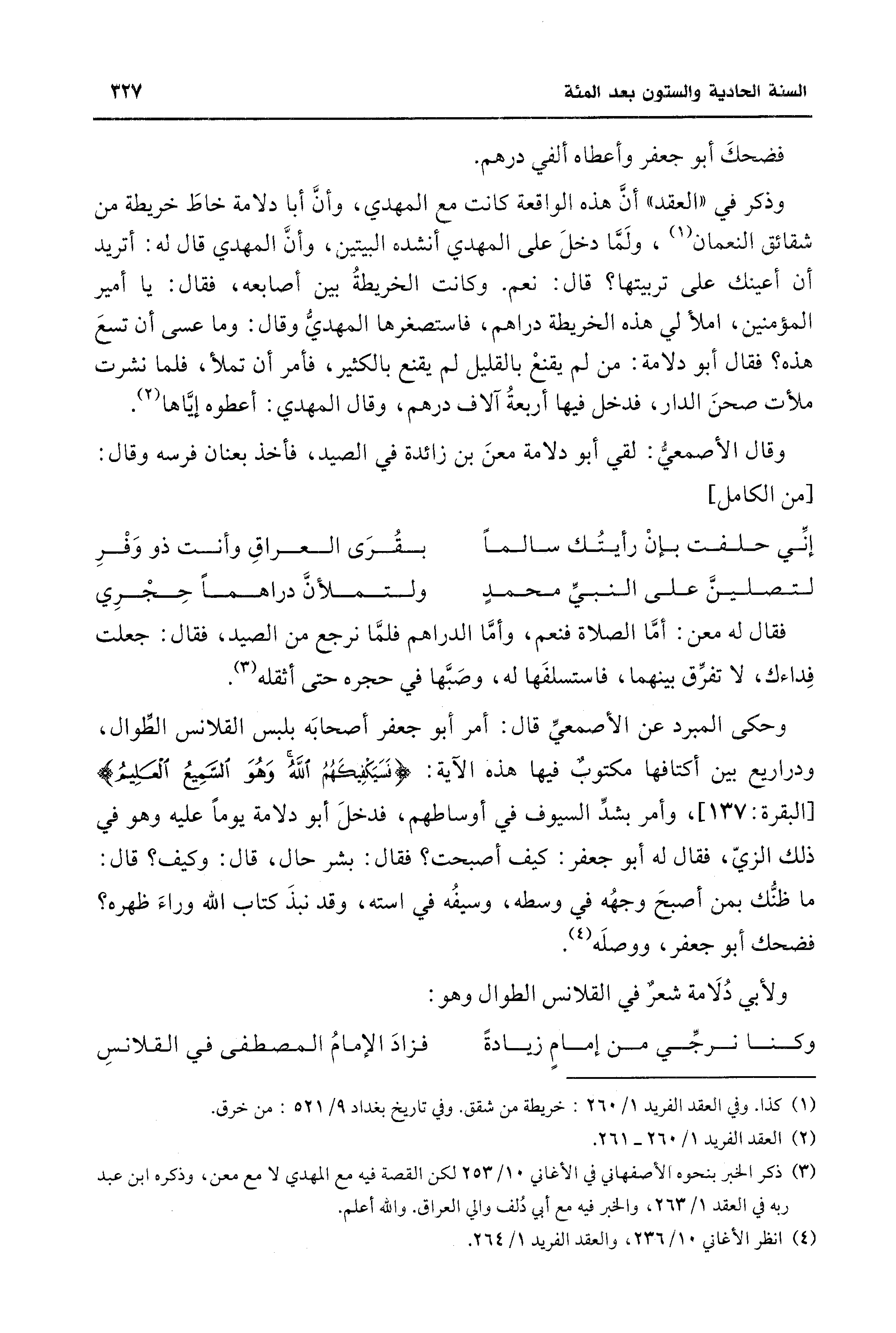 وحكى المبرد عن الأصمعيِّ قال: أمر أبو جعفر أصحابَه بلبس القلانس الطِّوال، ودراريع بين أكتافها مكتوب فيها هذه الآية: {فَسَيَكْفِيكَهُمُ اللَّهُ وَهُوَ السَّمِيعُ الْعَلِيمُ} [البقرة: 137]، وأمر بشدِّ السيوف في أوساطهم، فدخلَ أبو دلامة يومًا عليه وهو في ذلك الزيّ، فقال له أبو جعفر: كيف أصبحت؟ فقال: بشر حال، قال: وكيف؟ قال: ما ظنُّك بمن أصبحَ وجهُه في وسطه، وسيفُه في استه، وقد نبذَ كتاب الله وراءَ ظهره؟ فضحك أبو جعفر، ووصلَه (¬4).