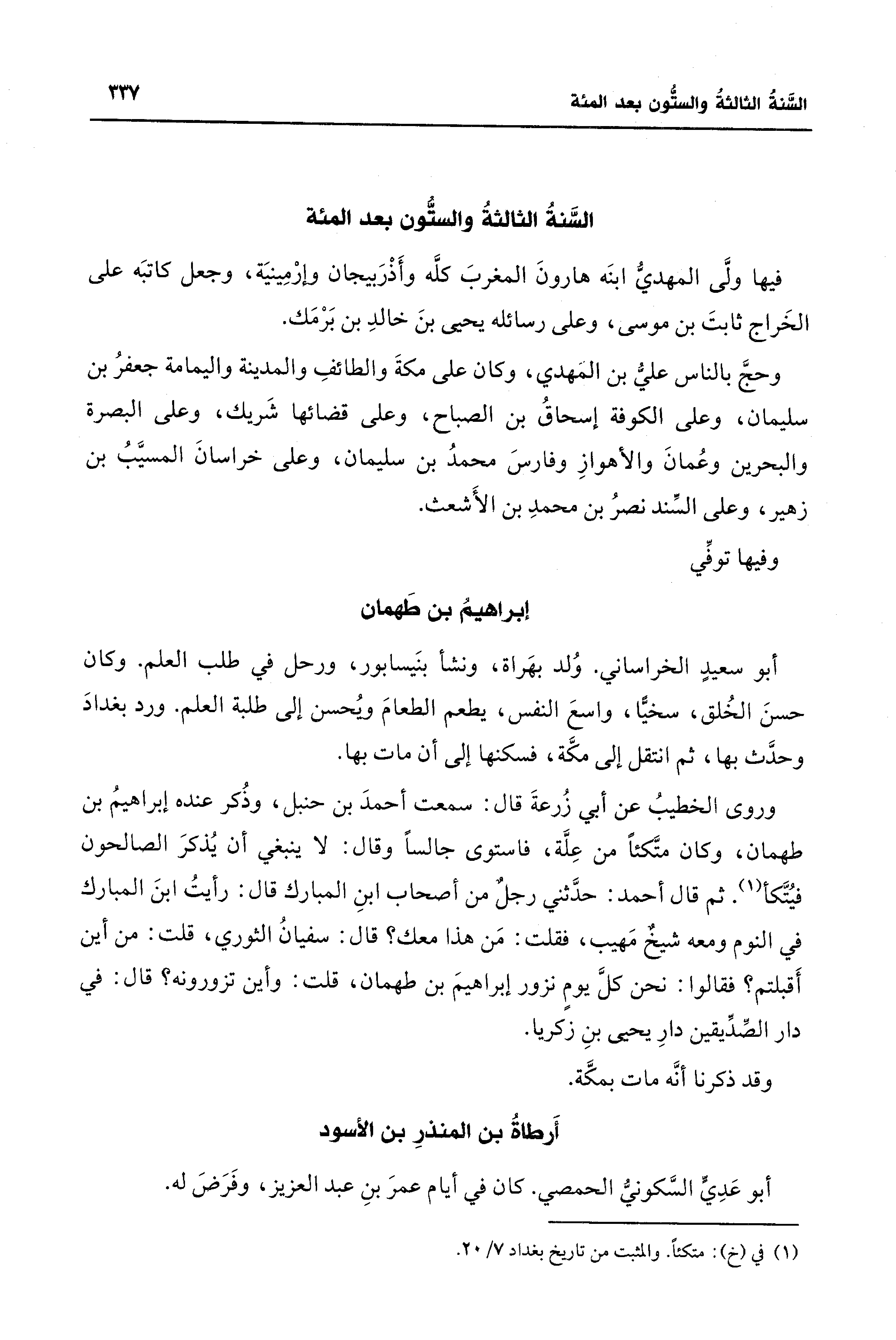 وروى الخطيبُ عن أبي زُرعةَ قال: سمعت أحمدَ بن حنبل، وذُكر عنده إبراهيمُ بن طهمان، وكان متَّكئًا من عِلَّة، فاستوى جالسًا وقال: لا ينبغي أن يُذكرَ الصالحون فيُتَّكأ (¬1). ثم قال أحمد: حدَّثني رجل من أصحاب ابنِ المبارك قال: رأيتُ ابنَ المبارك في النوم ومعه شيخٌ مَهيب، فقلت: مَن هذا معك؟ قال: سفيانُ الثوري، قلت: من أين أَقبلتم؟ فقالوا: نحن كلَّ يومٍ نزور إبراهيمَ بن طهمان، قلت: وأين تزورونه؟ قال: في دار الصِّدِّيقين دارِ يحيى بنِ زكريا.