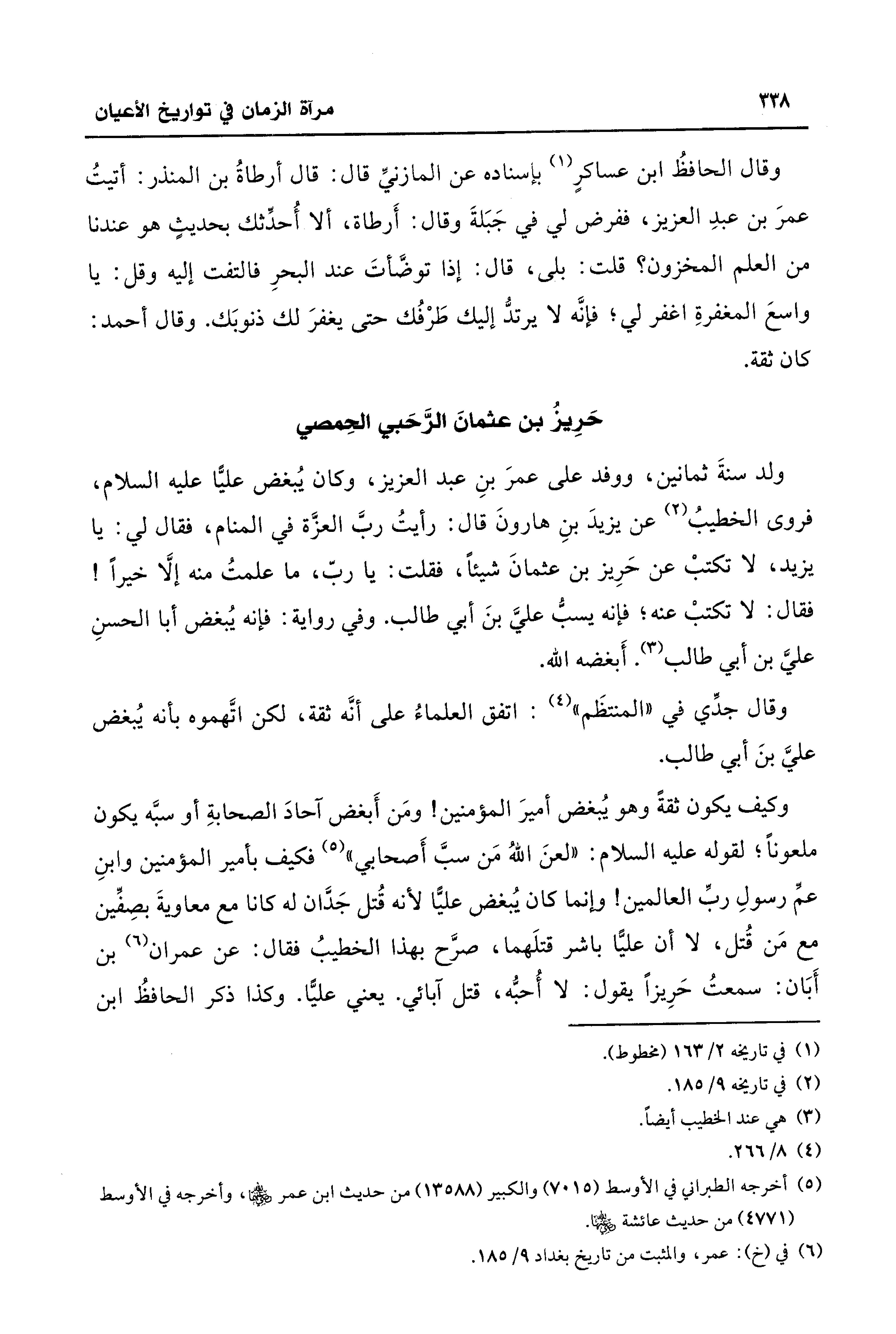 وكيف يكون ثقةً وهو يُبغض أميرَ المؤمنين! ومَن أَبغض آحادَ الصحابةِ أو سبَّه يكون ملعونًا؛ لقوله - عليه السلام -: "لعنَ اللهُ مَن سبَّ أَصحابي" (¬5) فكيف بأمير المؤمنين وابنِ عمِّ رسولِ ربِّ العالمين! وإنما كان يُبغض عليا لأنه قُتل جَدَّان له كانا مع معاويةَ بصِفِّين مع مَن قُتل، لا أن عليًّا باشر قتلَهما، صرَّح بهذا الخطيبُ فقال: عن عمران (¬6) بن أَبَان: سمعتُ حَرِيزًا يقول: لا أُحبُّه، قتل آبائي. يعني عليًّا. وكذا ذكر الحافظُ ابن