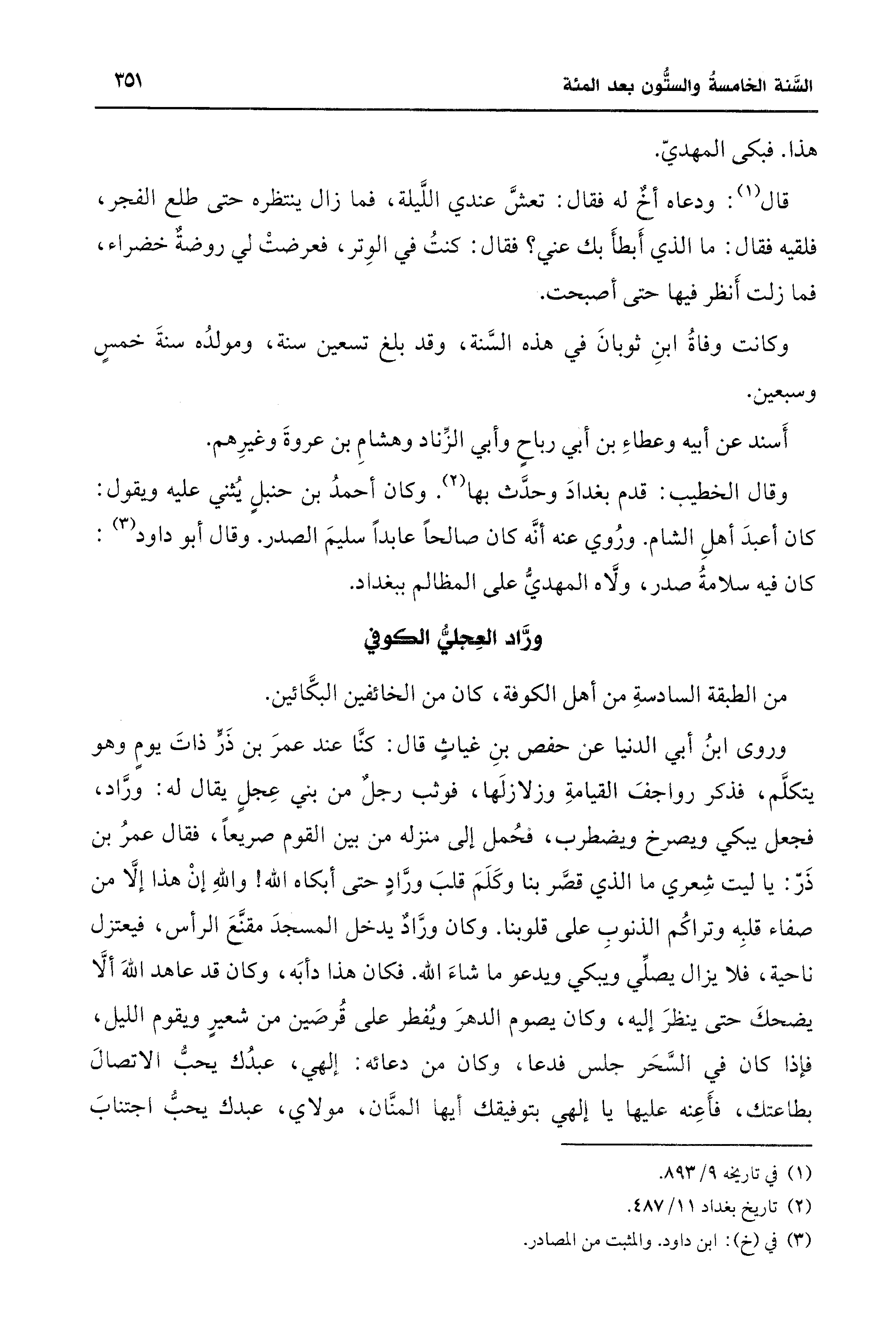 وروى ابنُ أبي الدنيا عن حفص بنِ غياثٍ قال: كنّا عند عمرَ بن ذَرٍّ ذاتَ يوم وهو يتكلَّم، فذكر رواجفَ القيامةِ وزلازلَها، فوثب رجلٌ من بني عِجلٍ يقال له: ورَّاد، فجعل يبكي ويصرخ ويضطرب، فحمل إلى منزله من بين القوم صريعًا، فقال عمرُ بن ذَرّ: يا ليت شعري ما الذي قصَّر بنا وكَلَم قلب ورَّادٍ حتى أبكاه الله! واللهِ إنْ هذا إلَّا من صفاء قلبِه وتراكُم الذنوبِ على قلوبنا. وكان ورَّادٌ يدخل المسجدَ مقنَّعَ الرأس، فيعتزل ناحية، فلا يزال يصلِّي ويبكي ويدعَو ما شاءَ الله. فكان هذا دأبَه، وكان قد عاهد الله ألا يضحك حتى ينظر إليه، وكان يصوم الدهر ويفطر على قُرصَين من شعيرٍ ويقوم الليل، فإذا كان في السَّحر جلس فدعا، وكان من دعائه: إلهي، عبدُك يحبُّ الاتصال بطاعتك، فأَعِنه عليها يا إلهي بتوفيقك أيها المنان، مولاي، عبدك يحب اجتنابَ