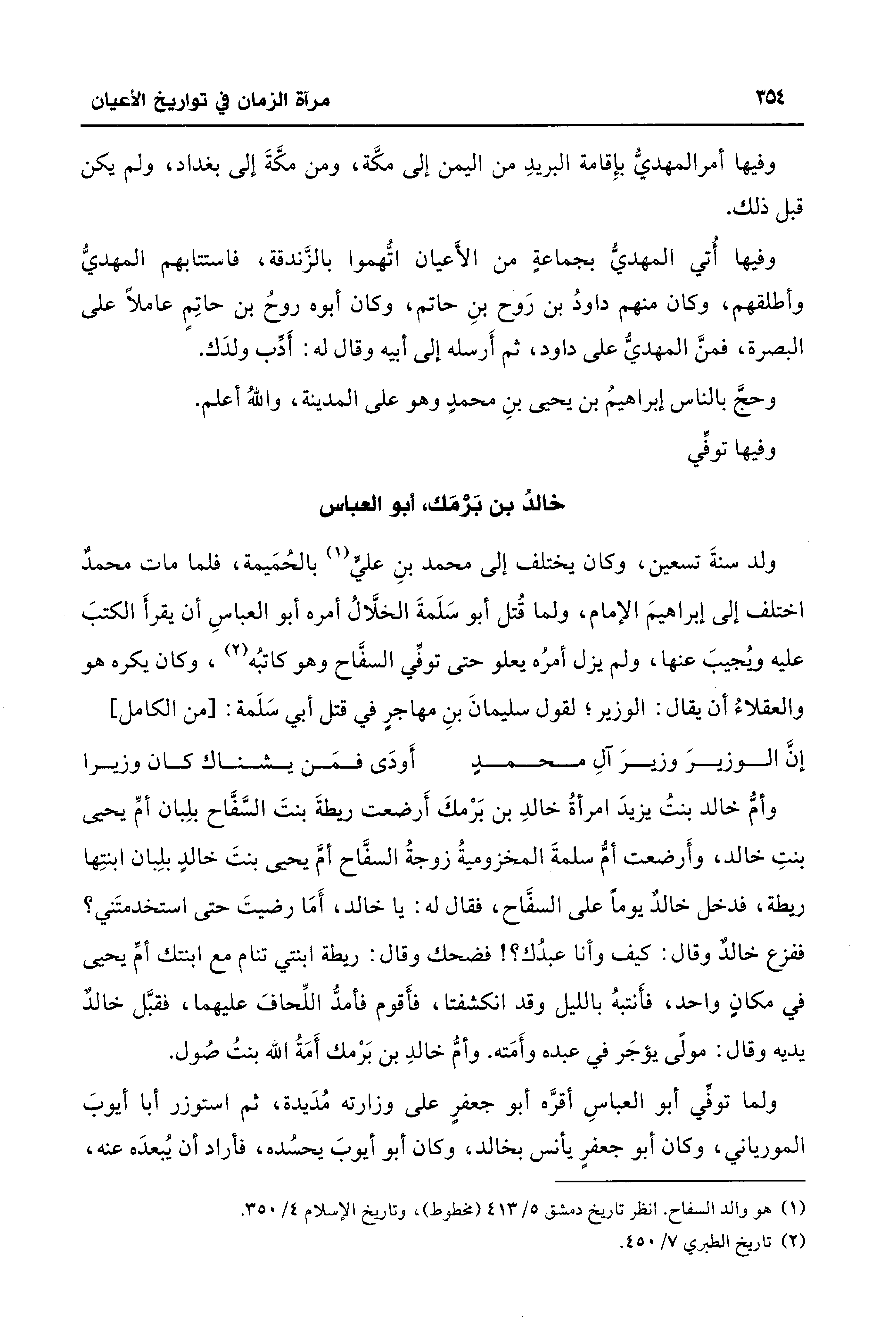 وأمُّ خالد بنتُ يزيدَ امرأةُ خالدِ بن بَرْمكَ أَرضعت ريطةَ بنتَ السَّفَّاح بلِبان أمِّ يحيى بنتِ خالد، وأَرضعت أمُّ سلمةَ المخزوميةُ زوجةُ السفَّاح أمَّ يحيى بنتَ خالدٍ بلِبان ابنتِها ريطة، فدخل خالدٌ يومًا على السفَّاح، فقال له: يَا خالد، أَمَا رضيتَ حتَّى استخدمتَي؟ ففزع خالد وقال: كيف وأنا عبدُك؟ ! فضحك وقال: ريطة ابنتي تنام مع ابنتك أمِّ يحيى في مكانٍ واحد، فأَنتبهُ بالليل وقد انكشفتا، فأَقوم فأمدُّ اللِّحافَ عليهما، فقبَّل خالدٌ يديه وقال: مولًى يؤجَر في عبده وأَمَته. وأمُّ خالدِ بن بَرْمك أَمَةُ الله بنتُ صُول.