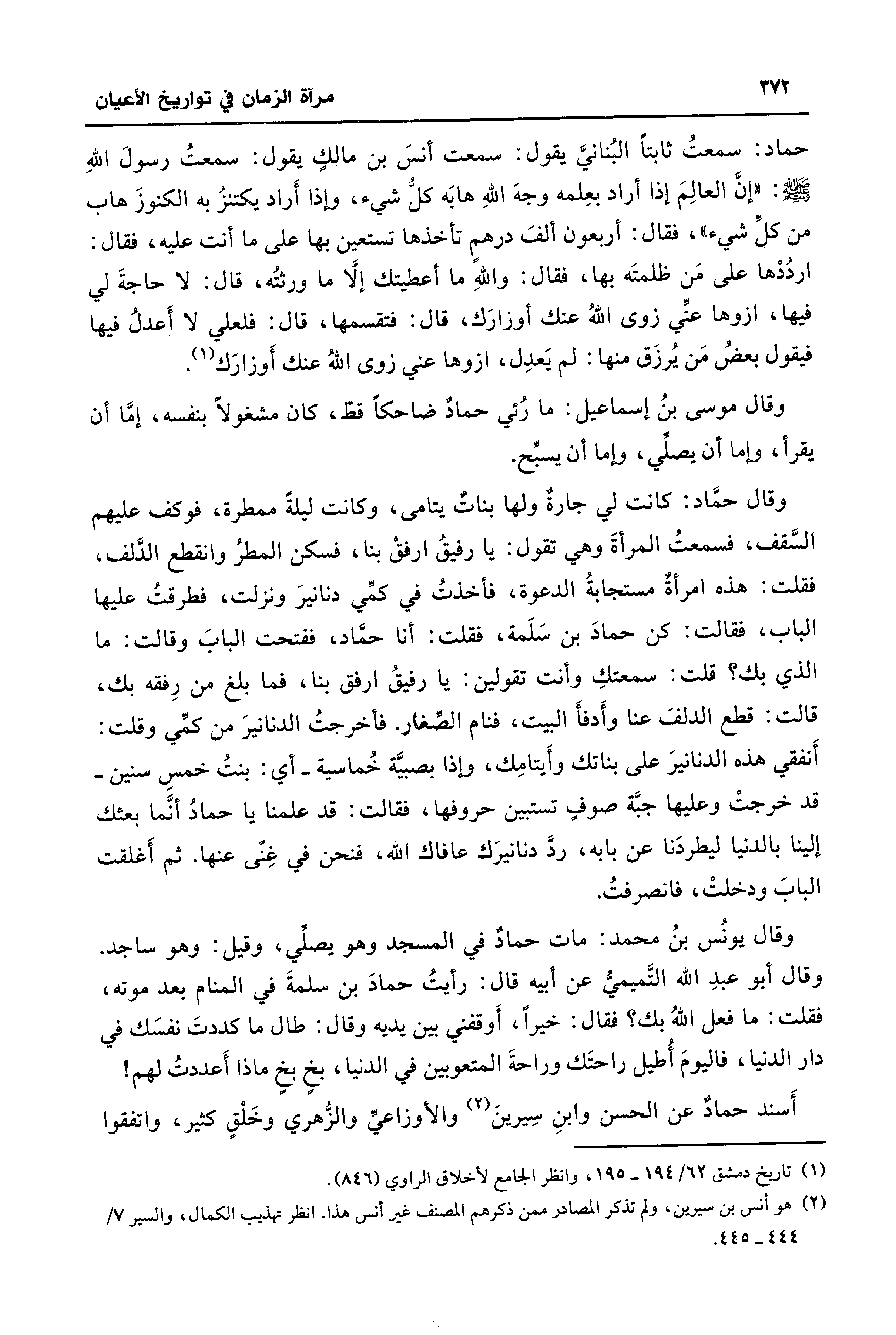 حماد: سمعتُ ثابتًا البُنانيَّ يقول. سمعت أنس بن مالكٍ يقول: سمعتُ رسولَ اللهِ - صلى الله عليه وسلم -: "إنَّ العالِمَ إذا أراد بعِلمه وجهَ اللهِ هابَه كلُّ شيء، وإذا أَراد يكتنزُ به الكنوزَ هاب من كلِّ شيء"، فقال: أربعون أنس درهمٍ تأخذها تستعين بها على ما أَنْتَ عليه، فقال: اردُدْها على مَن ظلمتَه بها، فقال: واللهِ ما أعطيتك إلَّا ما ورثتُه، قال: لا حاجةَ لي فيها، ازوها عنِّي زوى اللهُ عنك أوزارَك، قال: فتقسمها، قال: فلعلي لا أَعدلُ فيها فيقول بعضُ مَن يُرزَق منها: لم يَعدِل، ازوها عني زوى اللهُ عنك أَوزارَك (¬1).